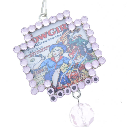 Vintage Campfire Cowgirl Art Pendant, Crystal on Copper or Pink Crystal on Silver, Cross frame, 48mm, Pack of 3
