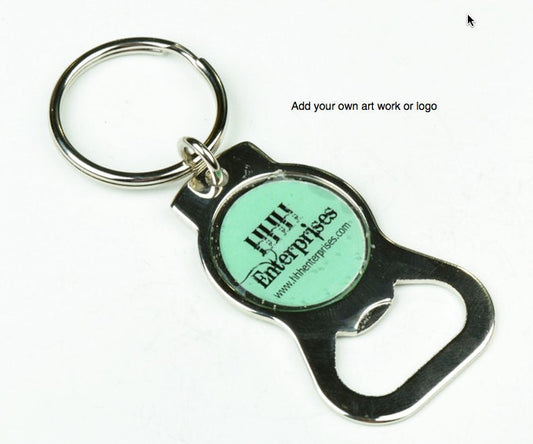 Custom Logo Photo Keychains with bottle opener, silver plate, bezel for embellishment, 12 each
