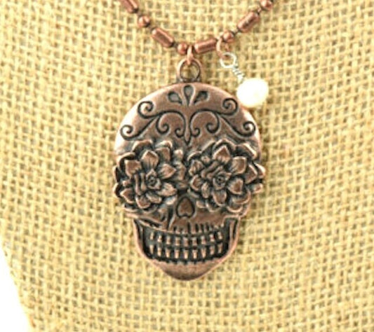 Sugar Skull Pendant Necklace with Pearl, Antique Gold or Vintage Copper Finish, 18" or 24" length, Made in USA, each