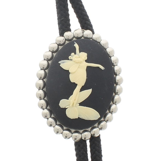 Fairy and Butterfly Cameo Bolo Tie with matching tips, gift bag, black & white, antique silver, 36" Black or Natural Jute, Made in USA, Each