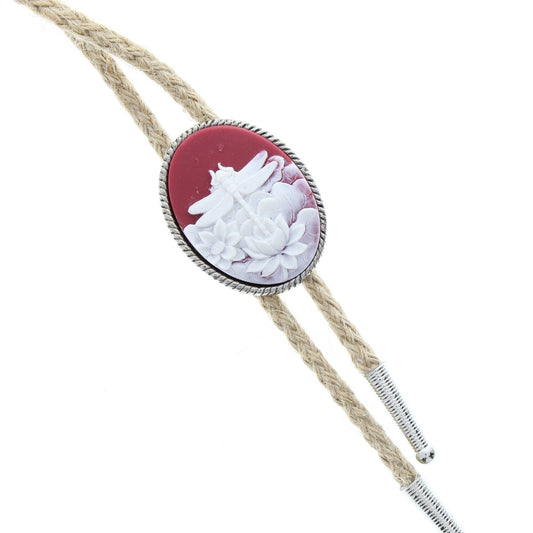 DragonFly Cameo Bolo Tie Lariat with matching tips, fabric gift bag, antique silver, red and white 36" Jute cord, Made in USA, Each