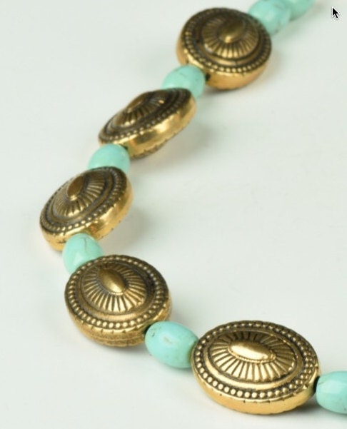 Southwest Concho Bead Necklace with Faux Turquoise, Antique Silver or Antique Gold, handmade, 18 inches, each