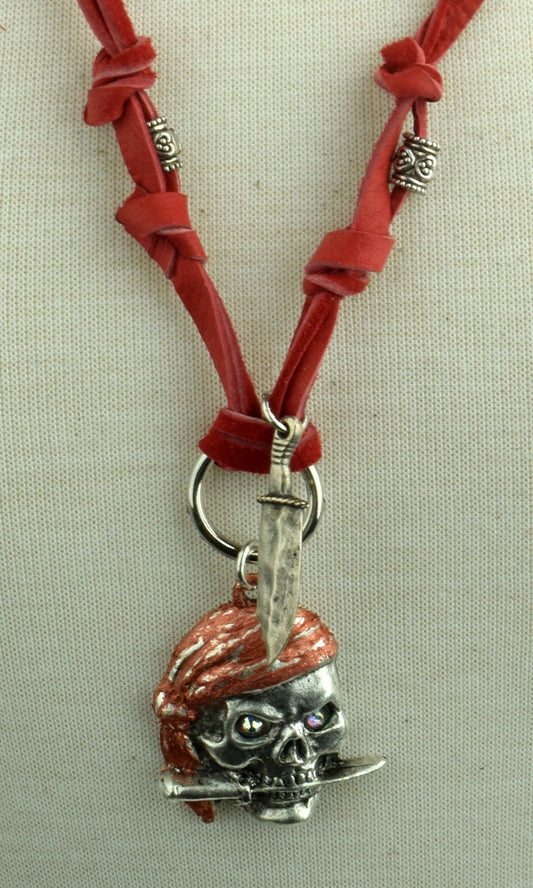 Pirate Skull Pendant Necklace with Knife, classic silver on 24" red sueded leather, Made in USA, each