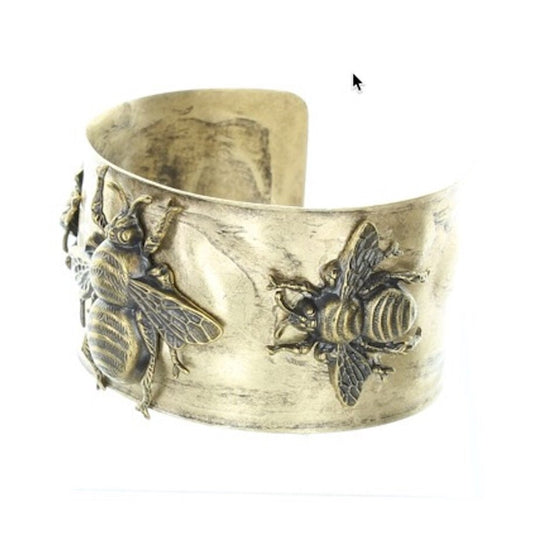 Honey Bee or Mason Bee Hammered Cuff Bracelet, Gift Box, Queen Bee, 3 Bees, 1.5" wide, antique gold, Made in USA, Each