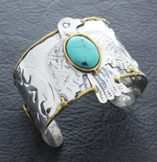 Southwestern Thunderbird Cuff Bracelet w/Turquoise, Silver and Brass, ea