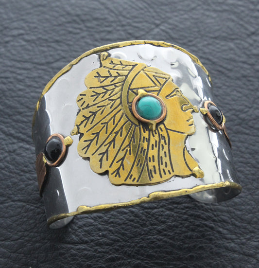 American Indian Chief Cuff Bracelet, Turquoise, Silver/Brass, ea