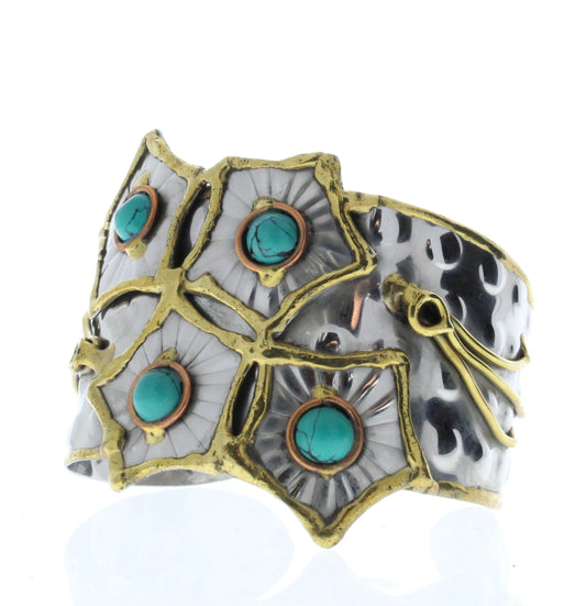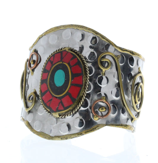 Red/Turquoise Oval Bracelet Cuff, Antique Silver w/Brass/Copper Inlay, ea