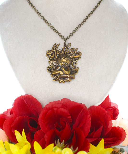 64mm x 53mm Vintage Brass "Mother" Cherub Necklace, made in USA, each