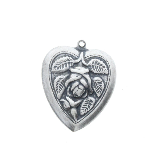 Bright Nickel Heart w/Rose Charm/Pendant, pack of 6