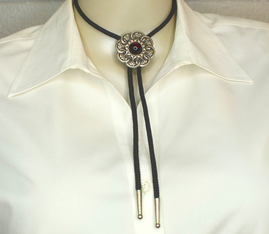 Red Ember Bolo Tie – Ornate Silver with Central Stone, Made in USA, 43.5mm