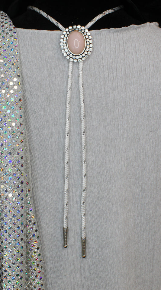 Prairie Rose: Blush Stone & White Cord Bolo Tie, Made in USA, 34.8mm x 40.7mm