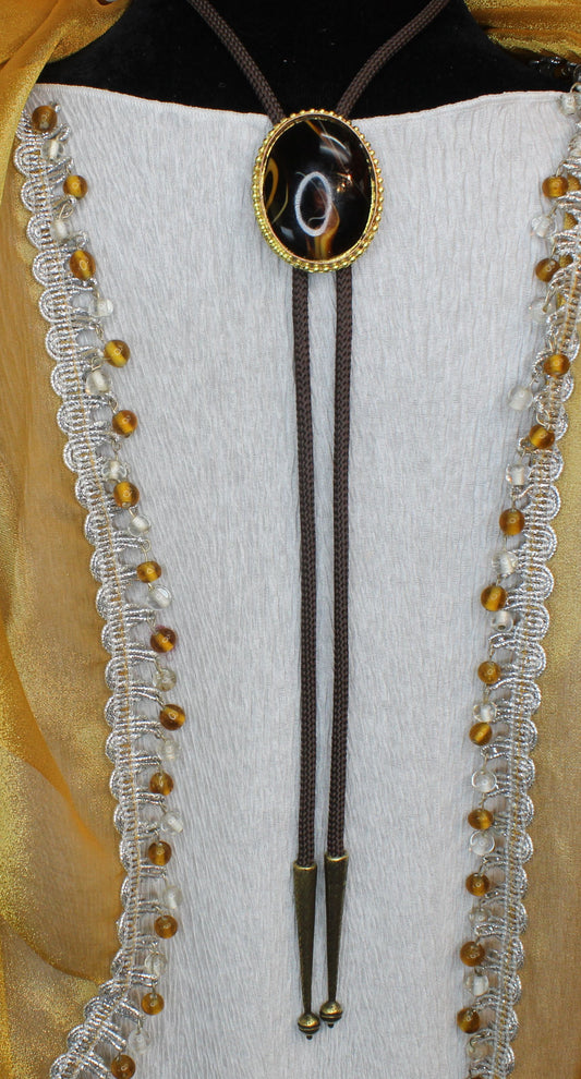 Molten Earth: Swirl Stone & Golden Frame Bolo Tie, Made in USA, 36.4mm x 46.9mm