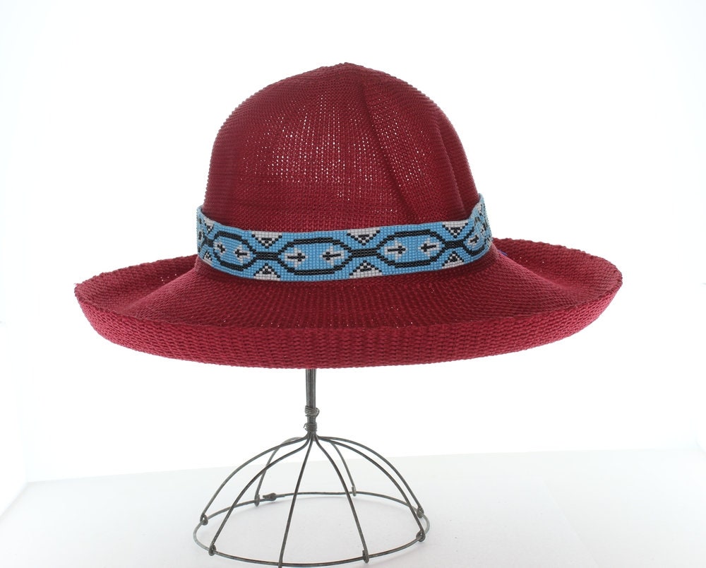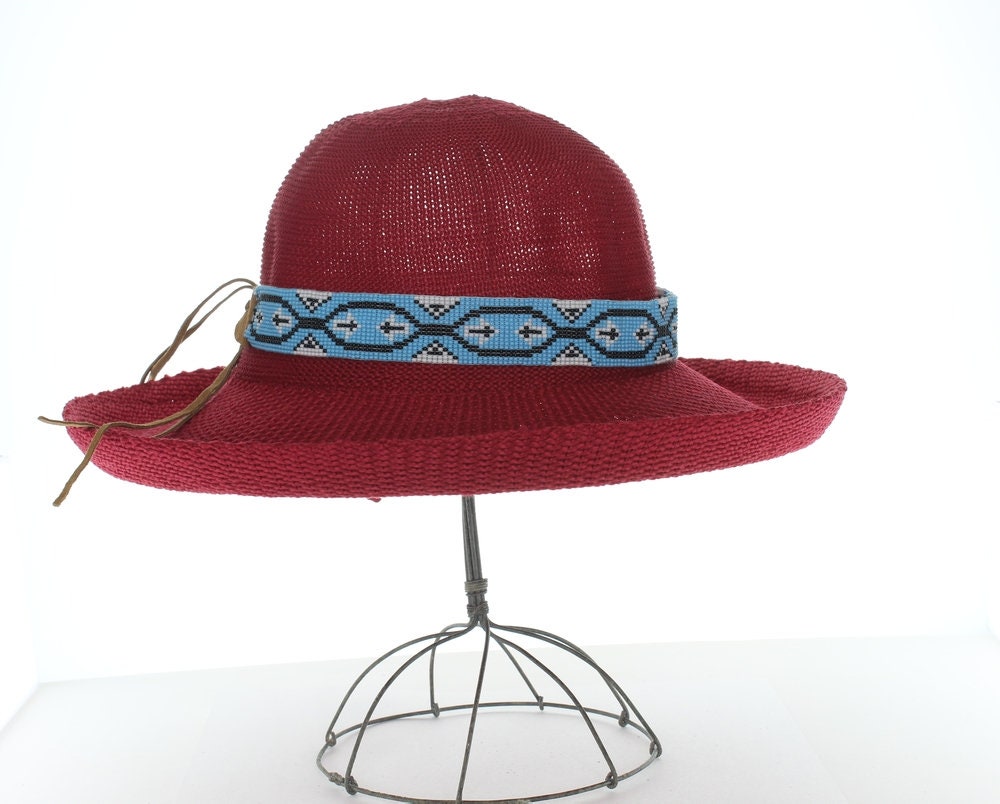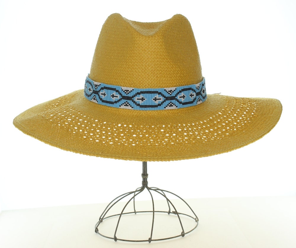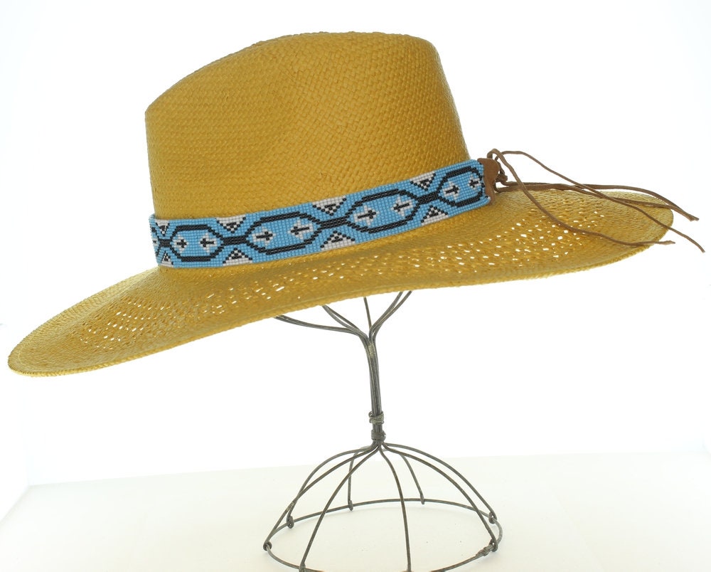28" Beaded Hat Band or Beaded Wrap Bracelet, Turquoise Black Cross Native American Beaded Design with 8" leather ties, Each