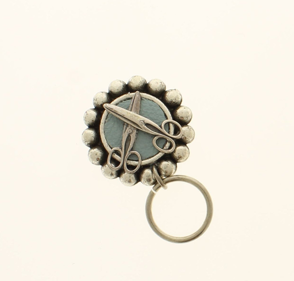 This charming eyeglass holder features a detailed scissor motif set against a soft blue center, framed by a beaded silver-tone border. The vintage-inspired design blends sewing-room character with everyday practicality. A sturdy attached ring keeps glasses secure and within easy reach, making it a stylish accessory for crafters and sewing enthusiasts alike.