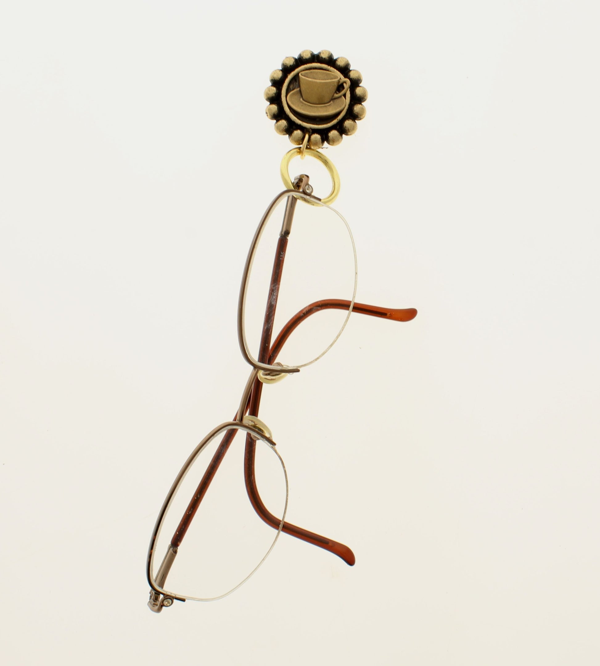 This charming eyeglass holder features a raised teacup and saucer design set within a beaded circular frame, finished in warm antiqued brass tones. The vintage-inspired motif adds a cozy, café-style touch, perfect for tea lovers. An attached ring securely holds glasses, blending decorative appeal with everyday practicality.