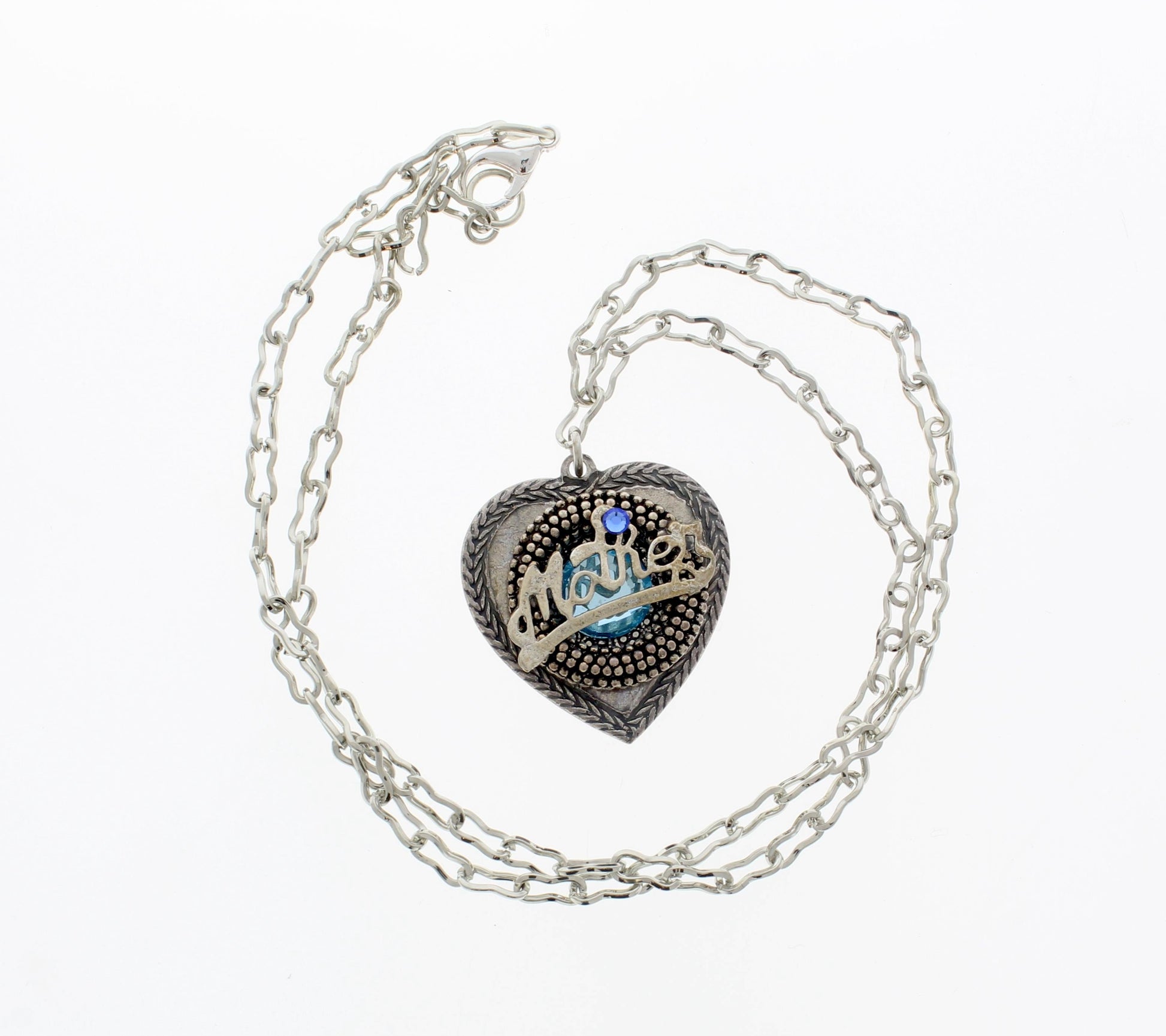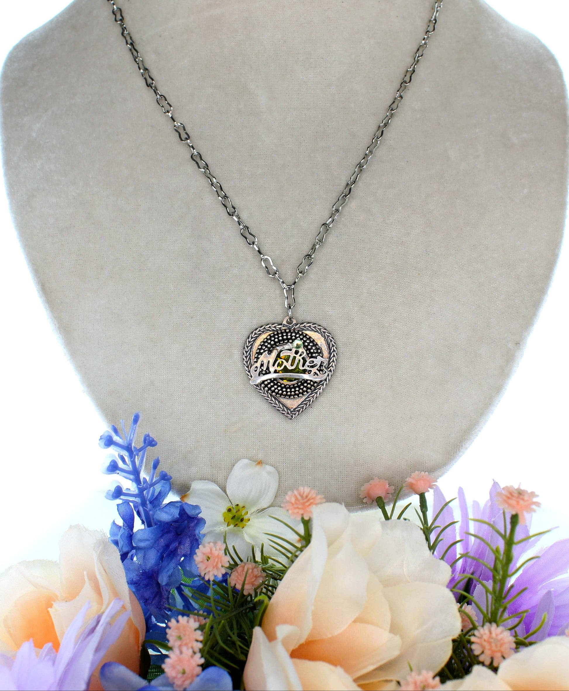 This beautifully crafted necklace features a heart-shaped pendant with the word Mother delicately scripted across the front in silver-tone metal. The pendant is adorned with intricate beadwork and raised dot detailing, framed by a braided pattern around the edges for a textured, vintage finish. A small green gem above the lettering adds a subtle, elegant sparkle. Paired with a bold, silver-tone chain, this piece offers both sentiment and style—perfect for honoring a beloved mother.