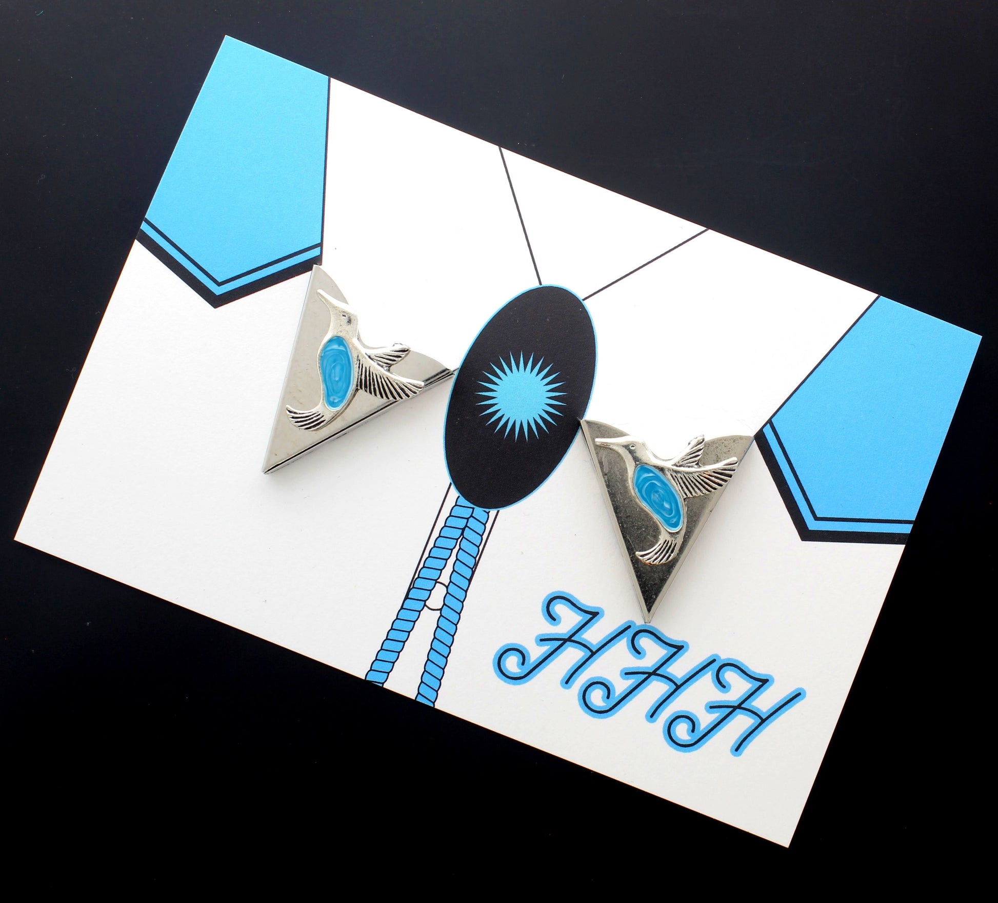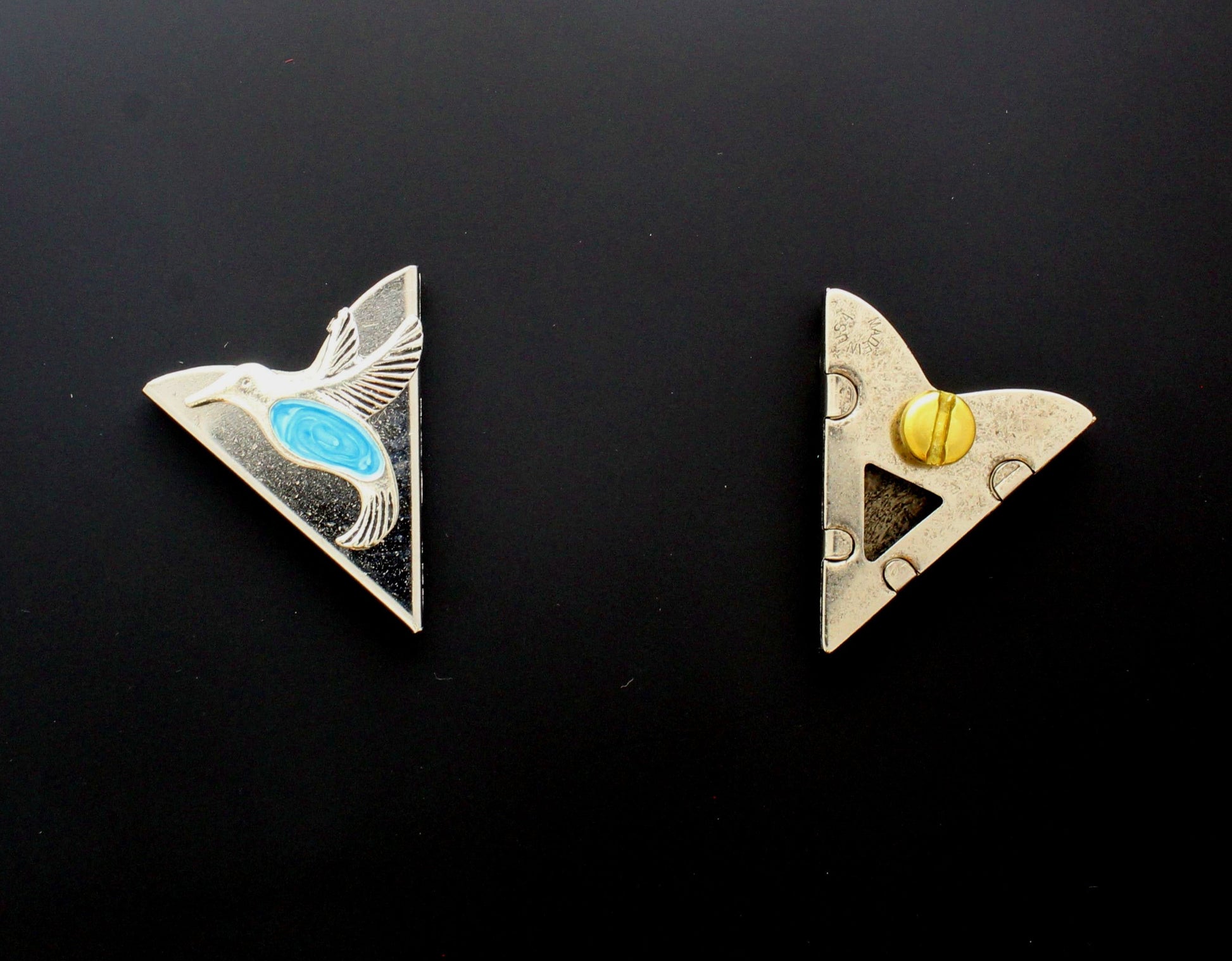 These mixed-metal collar tips bring together Southwest symbolism and steampunk flair. One features a soaring bird with a vivid turquoise inlay, while the other showcases an industrial-inspired design with etched brass accents and geometric cutouts. Bold, eclectic, and full of personality—perfect for the trailblazer who blends tradition with edge.