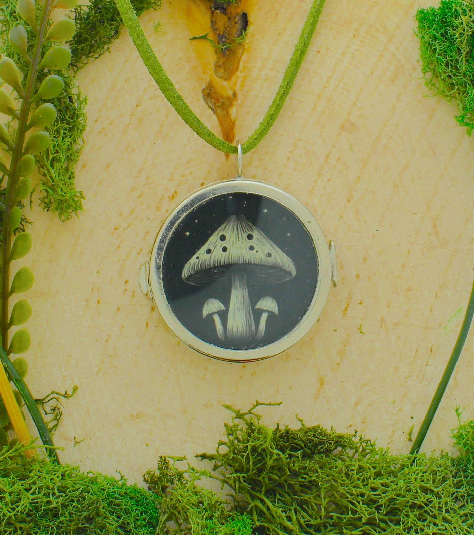 This pendant necklace features a round silver-tone locket on a soft green cord, framed around a moody, monochrome mushroom illustration. With its night-forest vibe and subtle vintage feel, it’s the perfect little talisman for lovers of woodland whimsy.