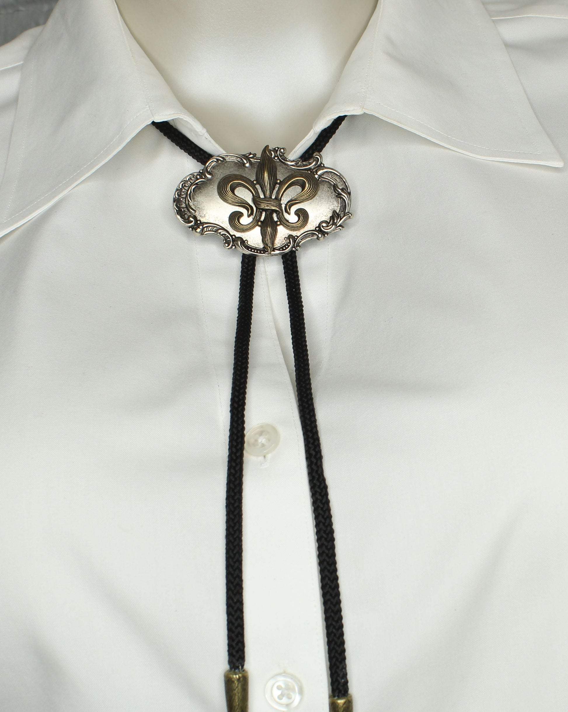 This bolo tie features an silver Victorian-style pendant, exuding timeless elegance and sophistication. At its center is a finely detailed antique gold fleur-de-lis, symbolizing nobility and heritage. The ornate design of the pendant, with its rich textures and classic motif, offers a touch of regal charm. Paired with a traditional braided cord, this bolo tie is a refined accessory that captures the essence of vintage style with a distinguished flair.