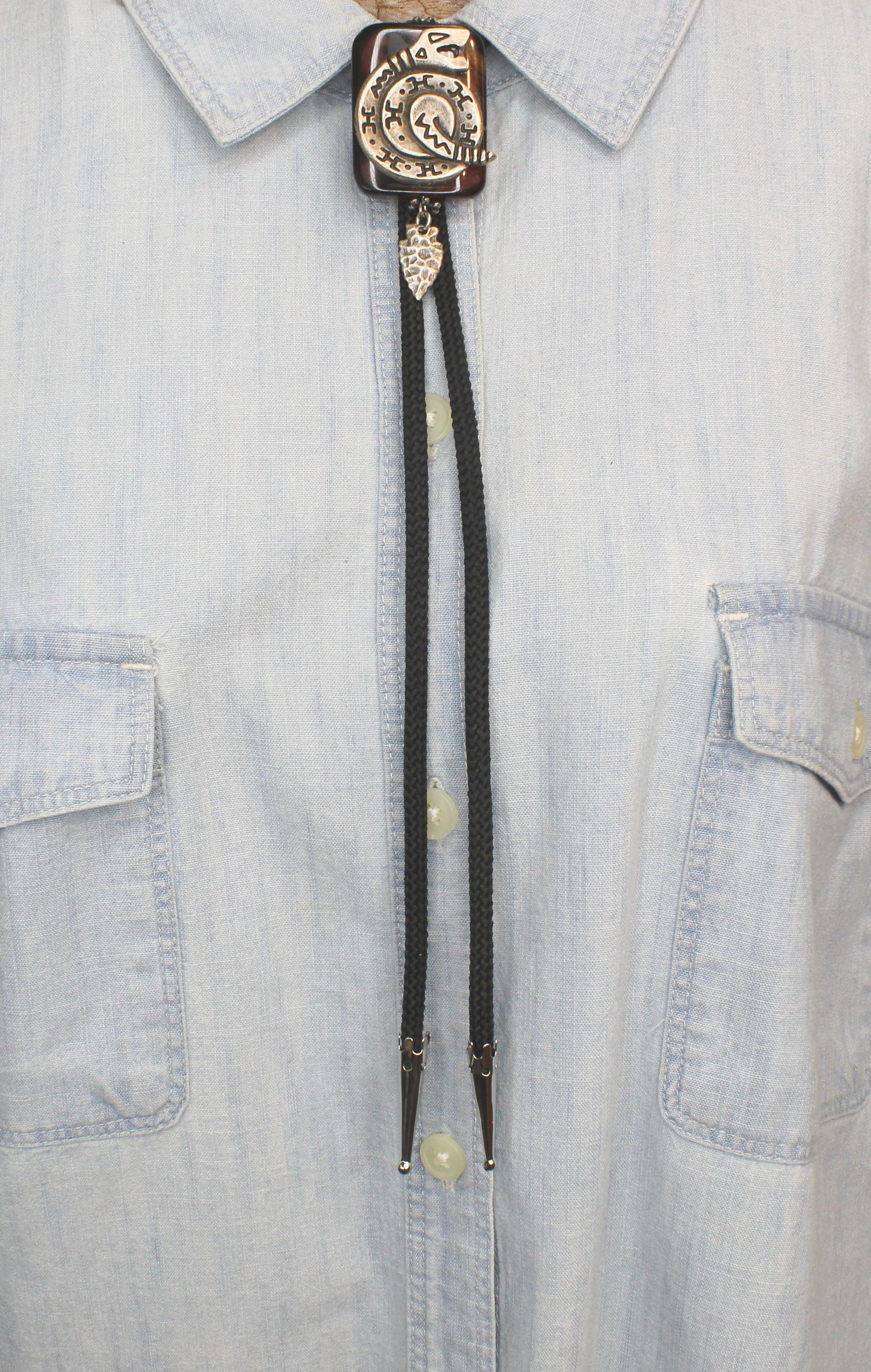 This bolo tie features a bold centerpiece with an intricate silver-tone design set against a warm tortoiseshell-style background. The braided black cord is finished with sleek silver tips, creating a striking blend of Southwestern flair and modern style. A distinctive accessory that adds character and artistry to any outfit.