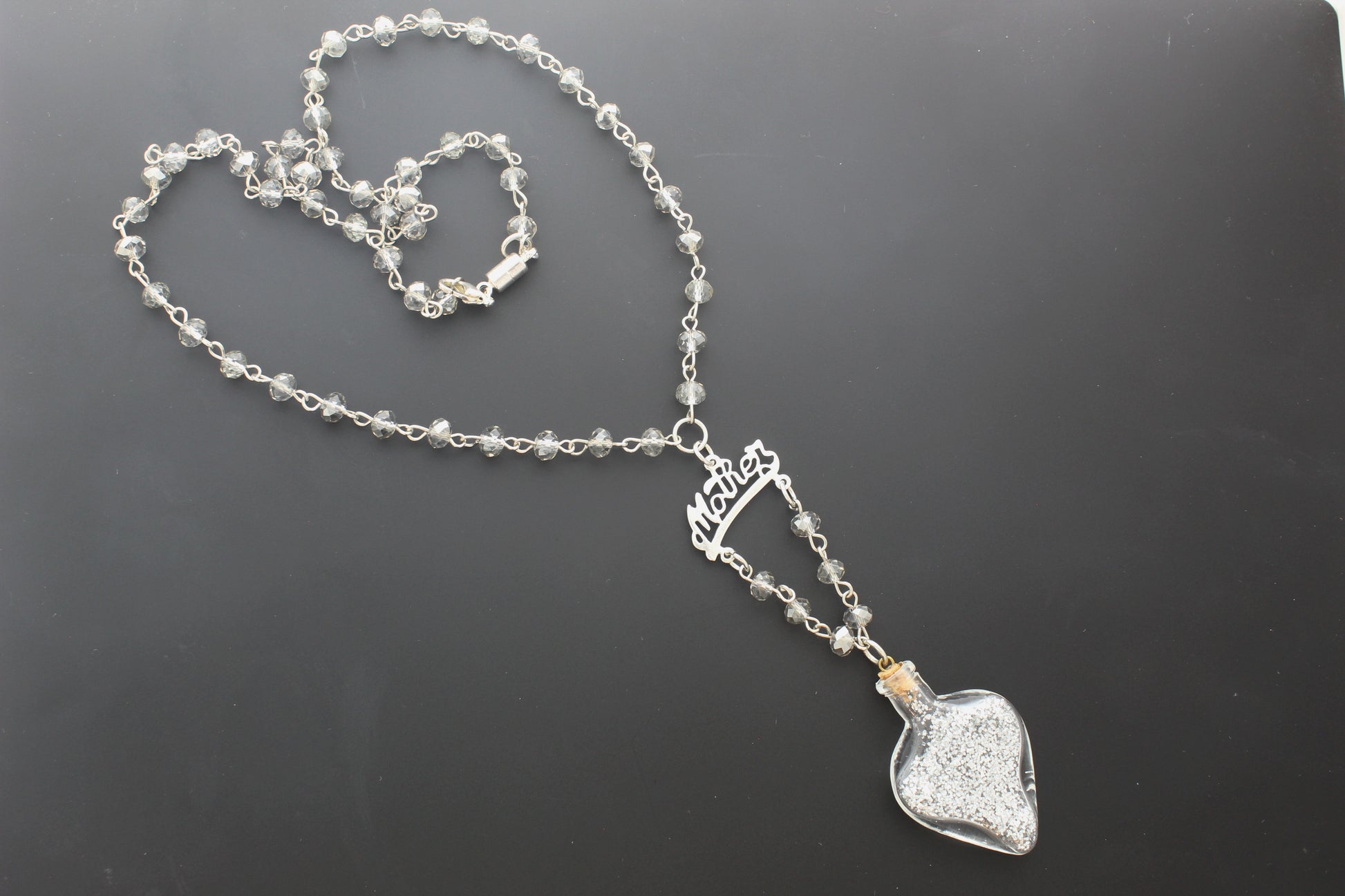 his elegant necklace features a silver-toned chain adorned with faceted clear beads, leading to a “Mother” charm and a heart-shaped glass vial pendant filled with shimmering silver glitter. A radiant tribute to love and motherhood, perfect for gifting or keepsake.