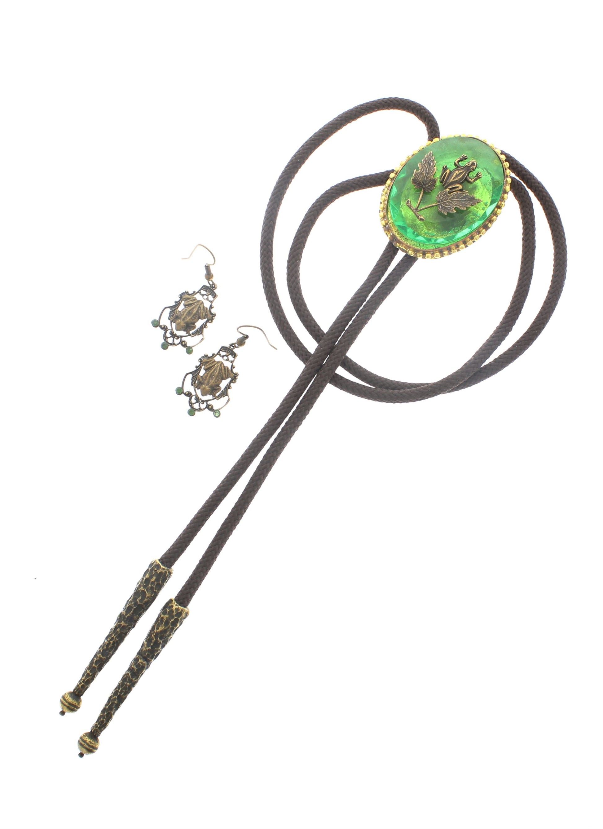 This striking bolo tie and earring set blends vintage and charm with bold elegance. The bolo features a vivid green oval centerpiece adorned with a delicate bronze-toned frog and leaf design, framed in a gold-toned beaded edge. Its braided brown cord is finished with textured antique-style tips for a refined look. The matching dangle earrings echo the floral motif, accented with small green beads for a cohesive finish. A unique statement set that perfectly balances rustic flair and timeless sophistication.