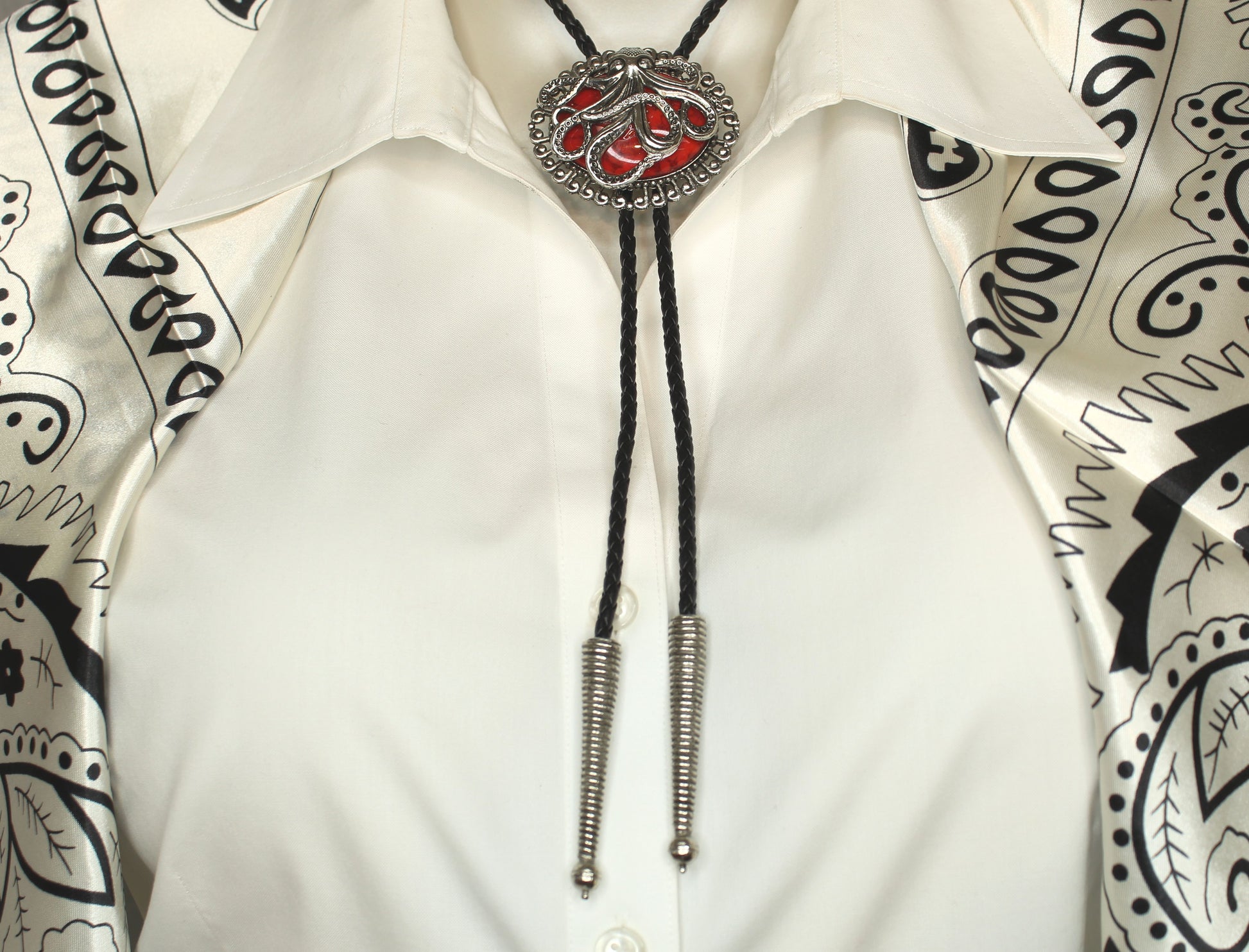 This bolo tie features a dark braided cord with silver-tone wrapped tips, centered by a round slide showcasing an intricately detailed silver octopus. Deep red inlays highlight the creature’s flowing tentacles, giving the piece a striking nautical-meets-Western look that stands out with bold character.