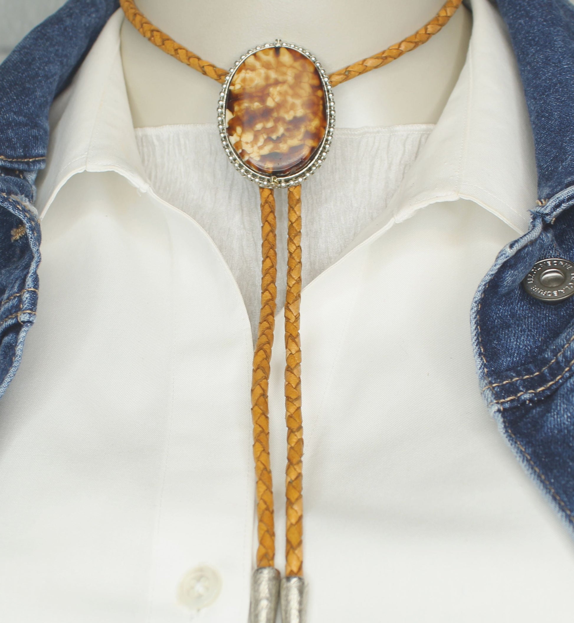 This bolo tie features a rich tan braided cord with silver-tone metal tips, accented by an oval stone centerpiece in warm caramel and cream marbling. Set in a beaded silver bezel, the natural patterning gives it an earthy, vintage-Western look that pairs easily with denim or dress shirts.