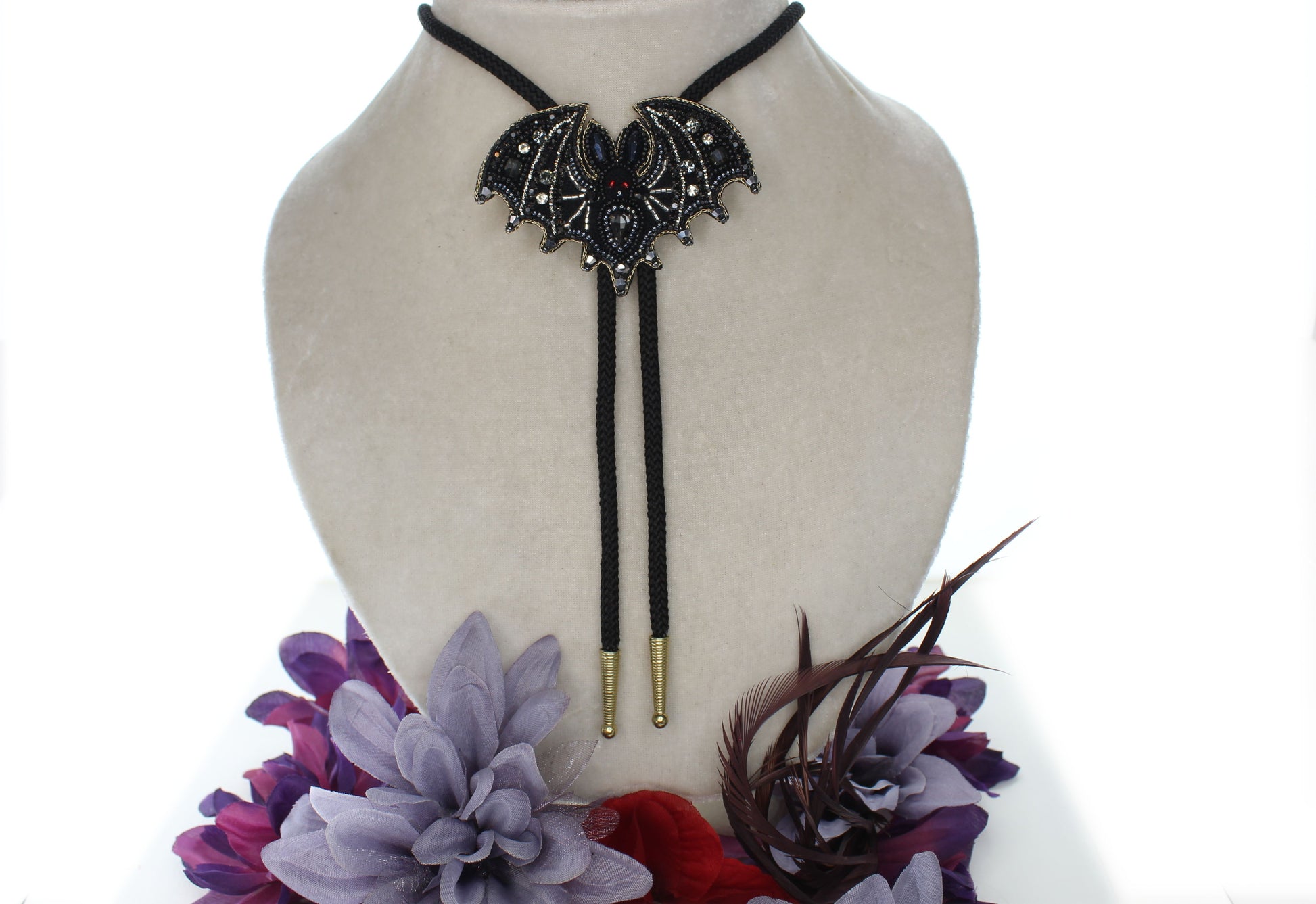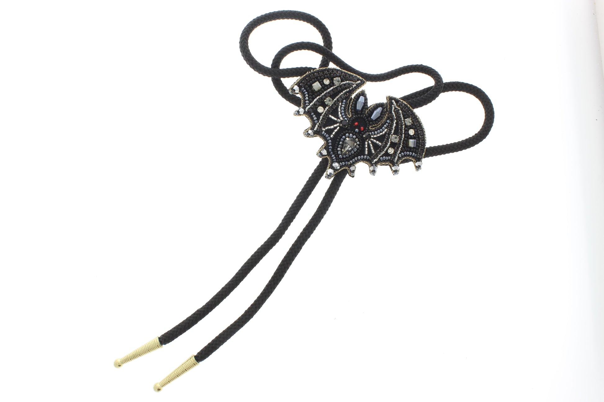 This handcrafted bolo tie showcases a stunning bat-shaped emblem, meticulously detailed with ornate wings and embedded stones. A vivid red gem anchors the center, while shimmering white accents add depth and drama to the design. Suspended from braided black cords with polished silver tips, this piece blends gothic elegance with artisan craftsmanship—perfect for Halloween, cosplay, or anyone drawn to the darker side of style.