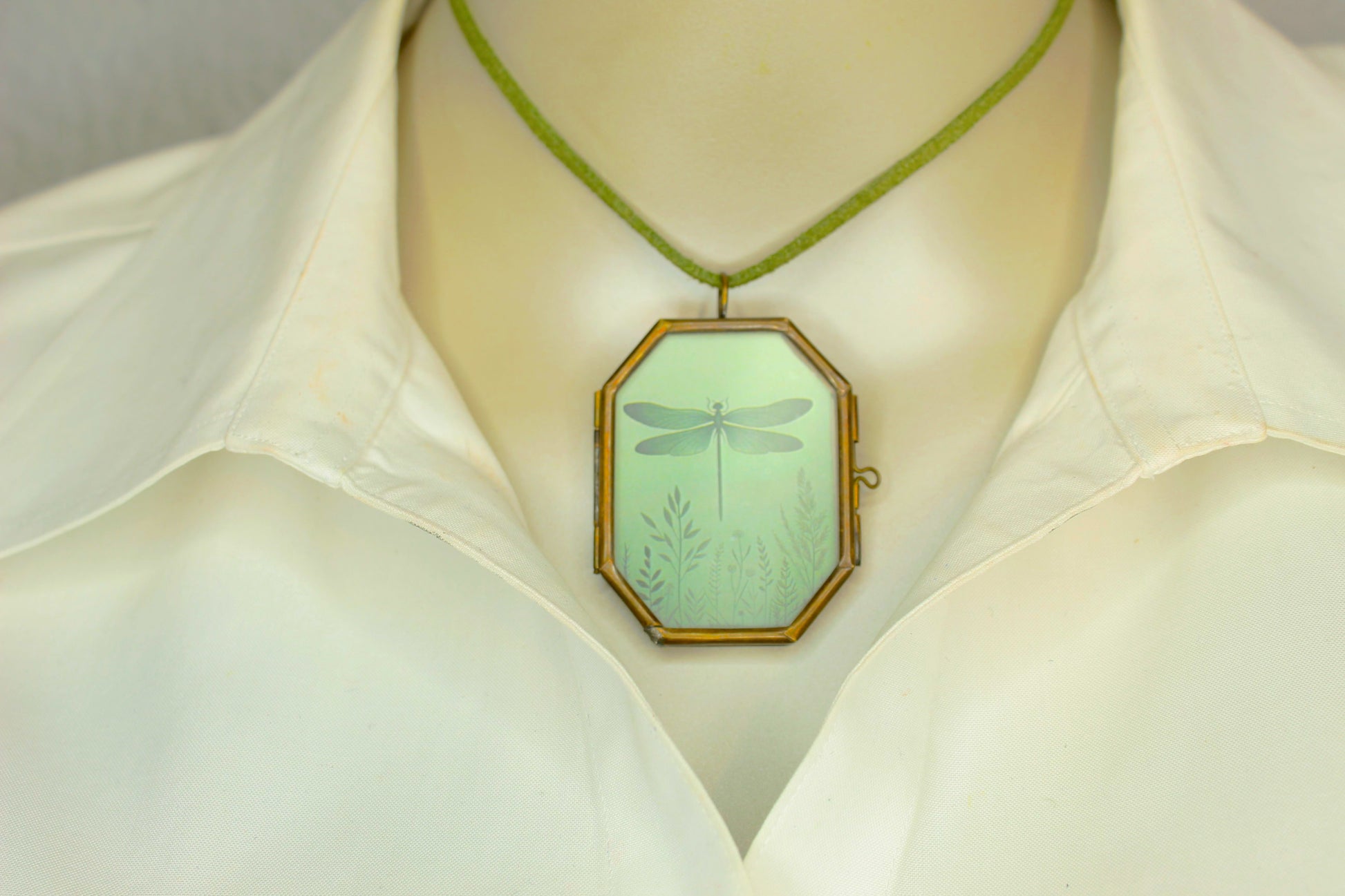 This pendant necklace features an octagon-shaped locket in an antique brass tone, hanging from a soft green cord. The front showcases a delicate dragonfly illustration over muted sage hues and botanical details, giving it a calm, nature-inspired charm with a hint of vintage wanderlust.