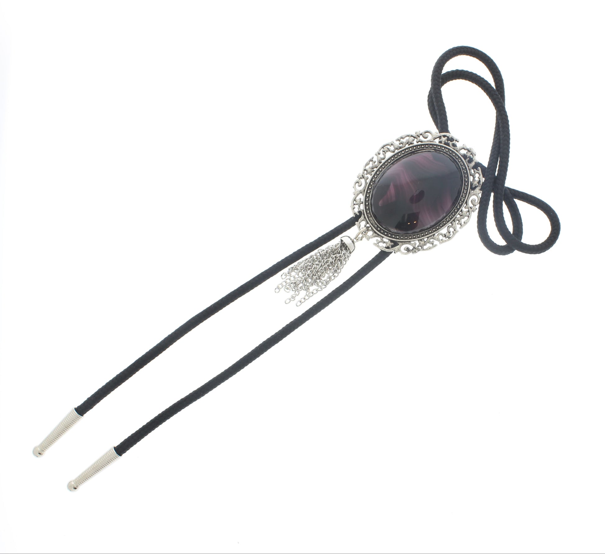 This bolo tie features a striking oval stone in rich violet hues, framed with ornate silver detailing. Finished with a sleek black cord, silver tips, and a touch of fringe, it blends Western traditions with bold, modern elegance.