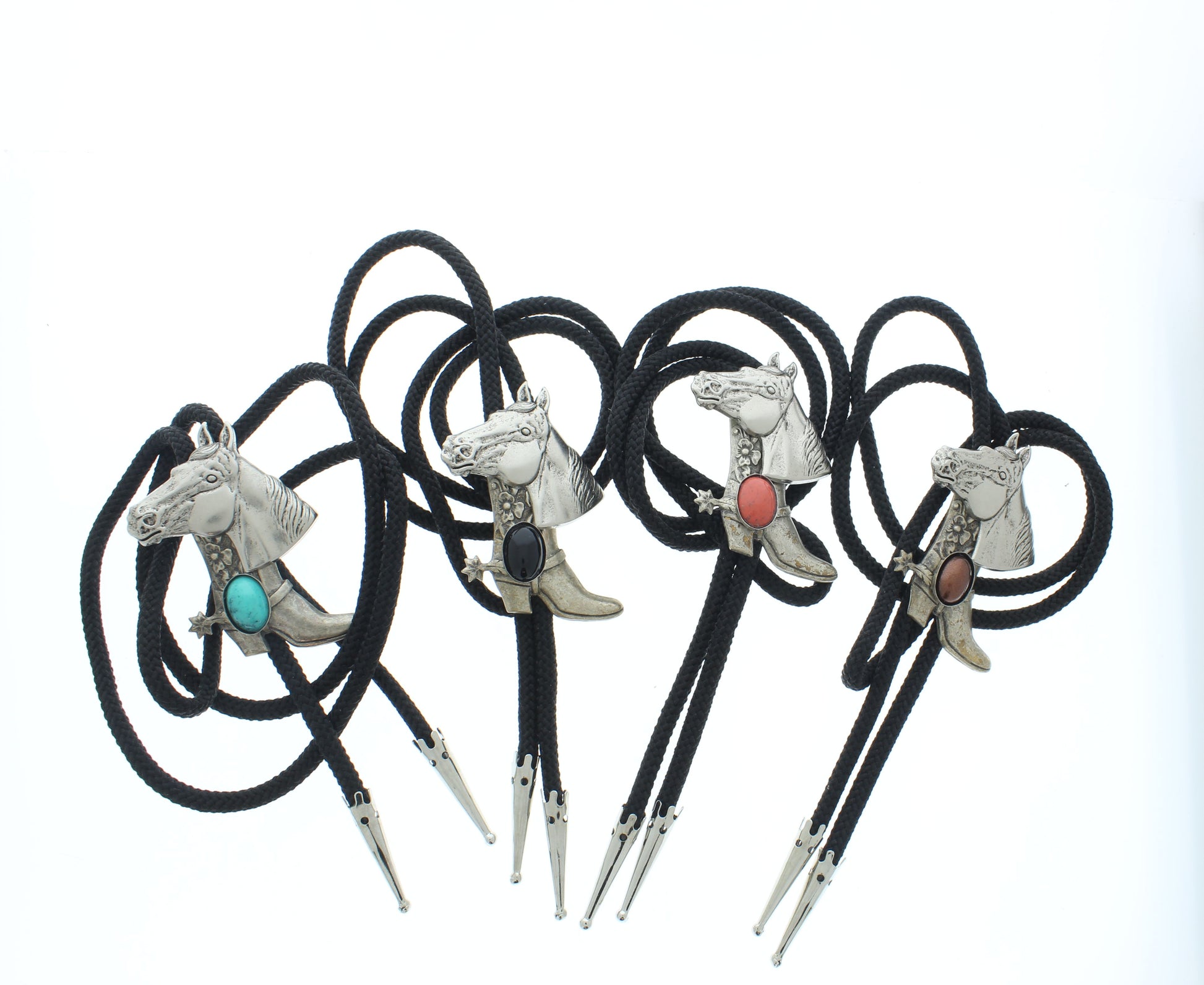 Horse & Cowboy Boot Bolo Tie, Turquoise, Black, Red or Brown Stone, made in USA, sold by each