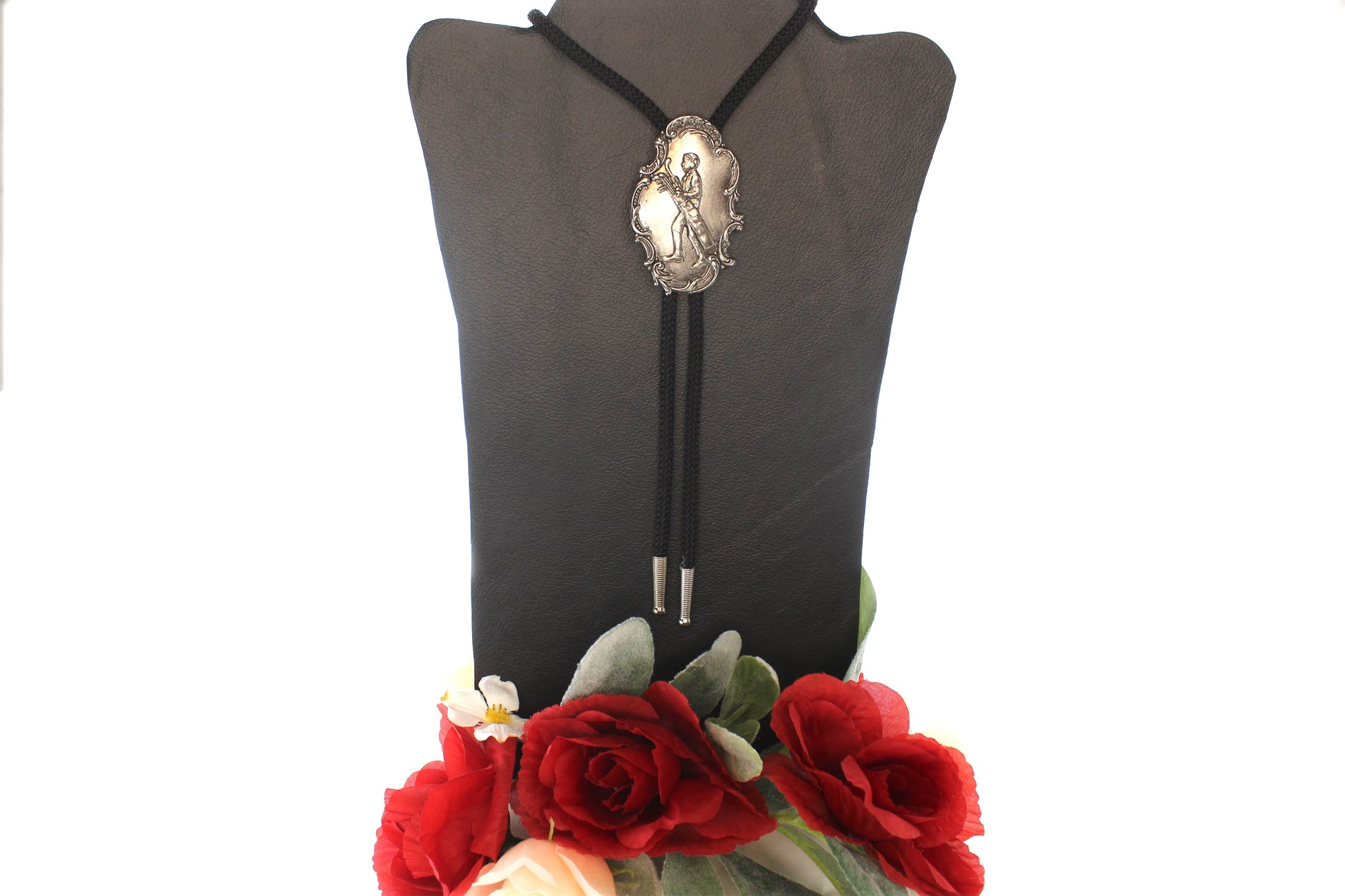 This bolo tie features a detailed silver-tone concho with an embossed design of a golfer mid-swing, framed by elegant scrolling edges that give it a vintage flair. The black braided cord and polished silver tips add a classic Western touch, making it a stylish accessory for golf enthusiasts and collectors alike. Perfect for adding a refined, sporty edge to both casual and dress attire.