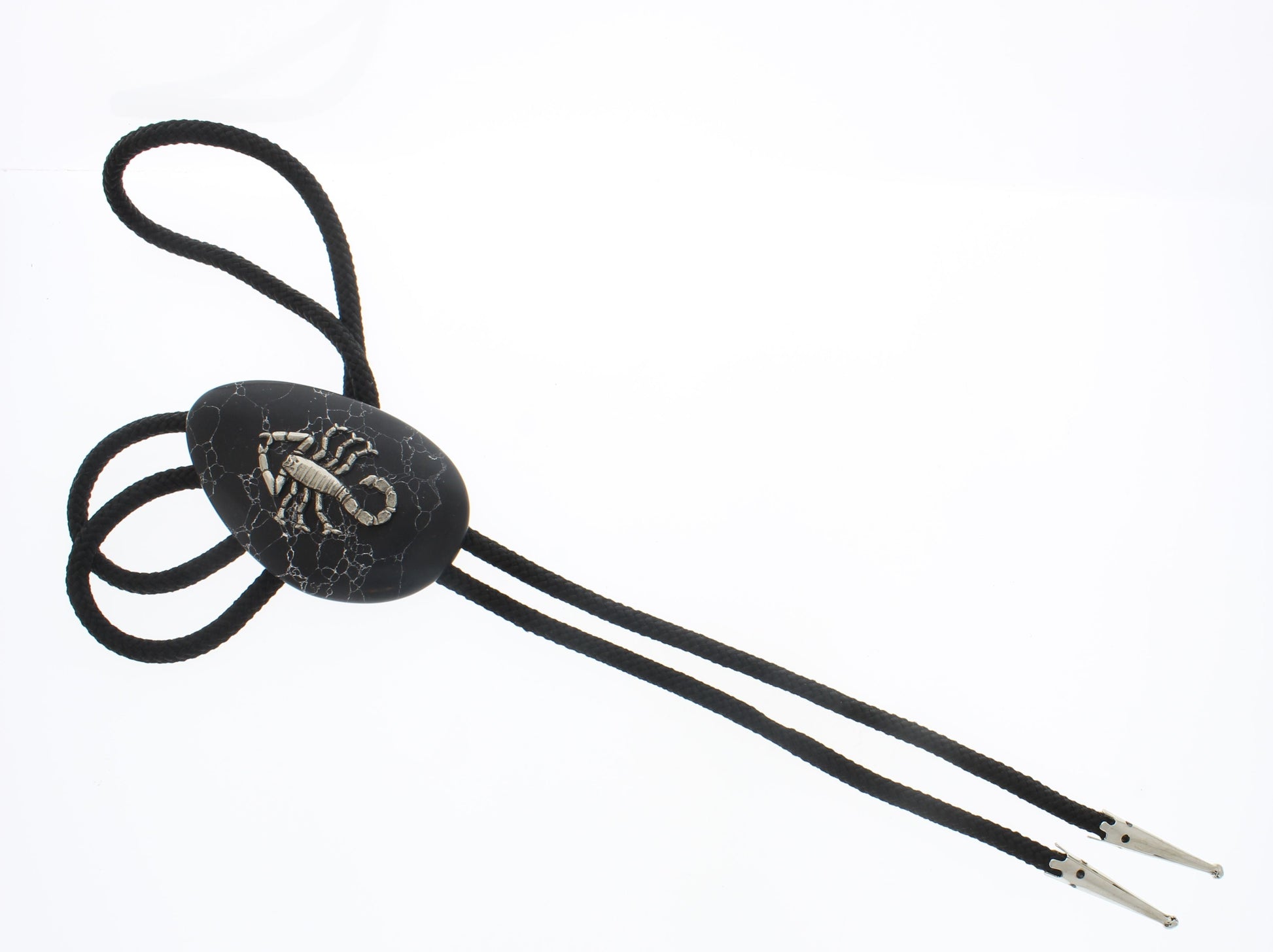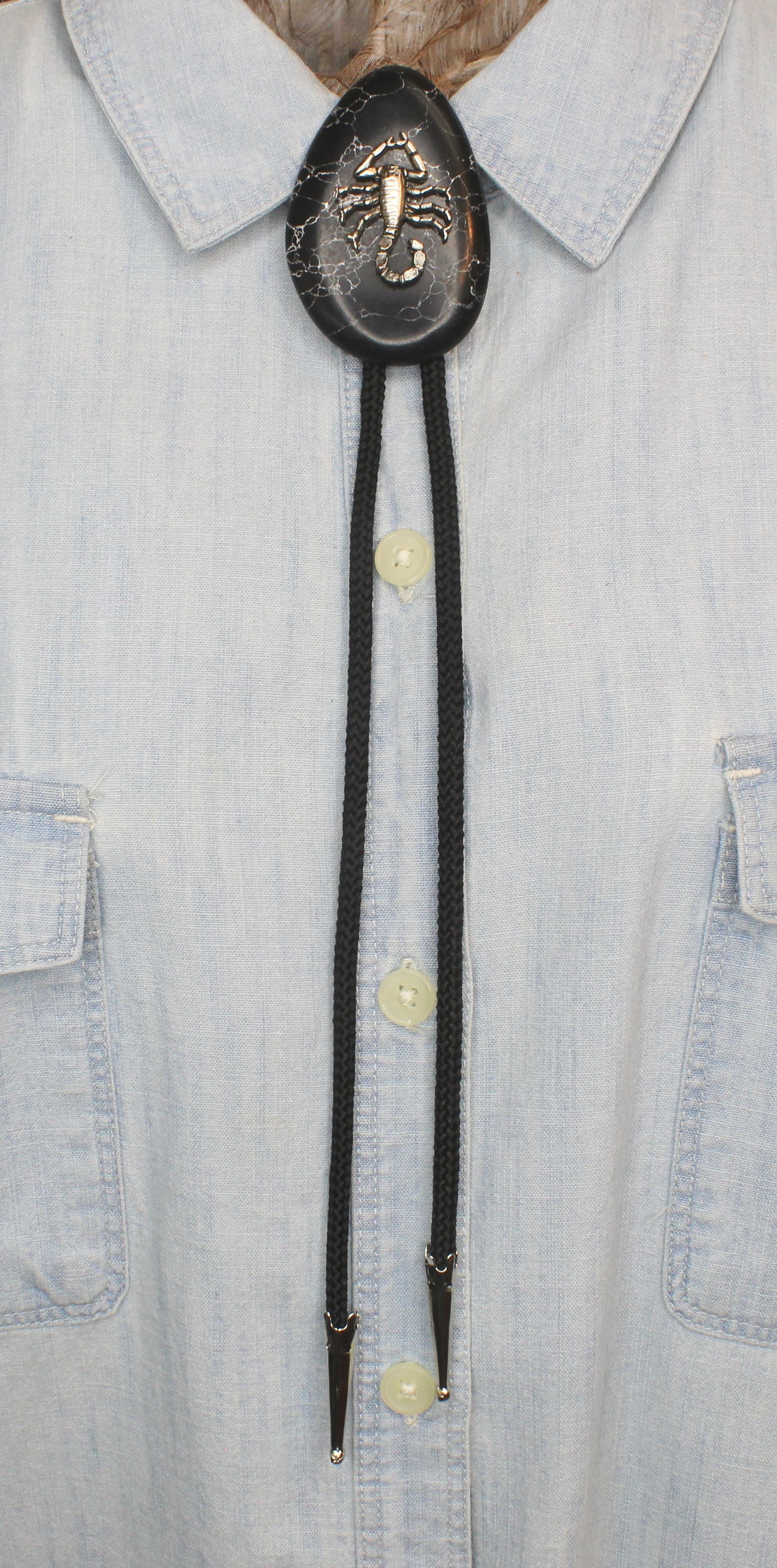Striking bolo tie featuring a black stone-like oval clasp with white veining, centered by a bold metallic scorpion design. Finished with braided black cords and sleek silver tips for a rugged, Southwestern edge.