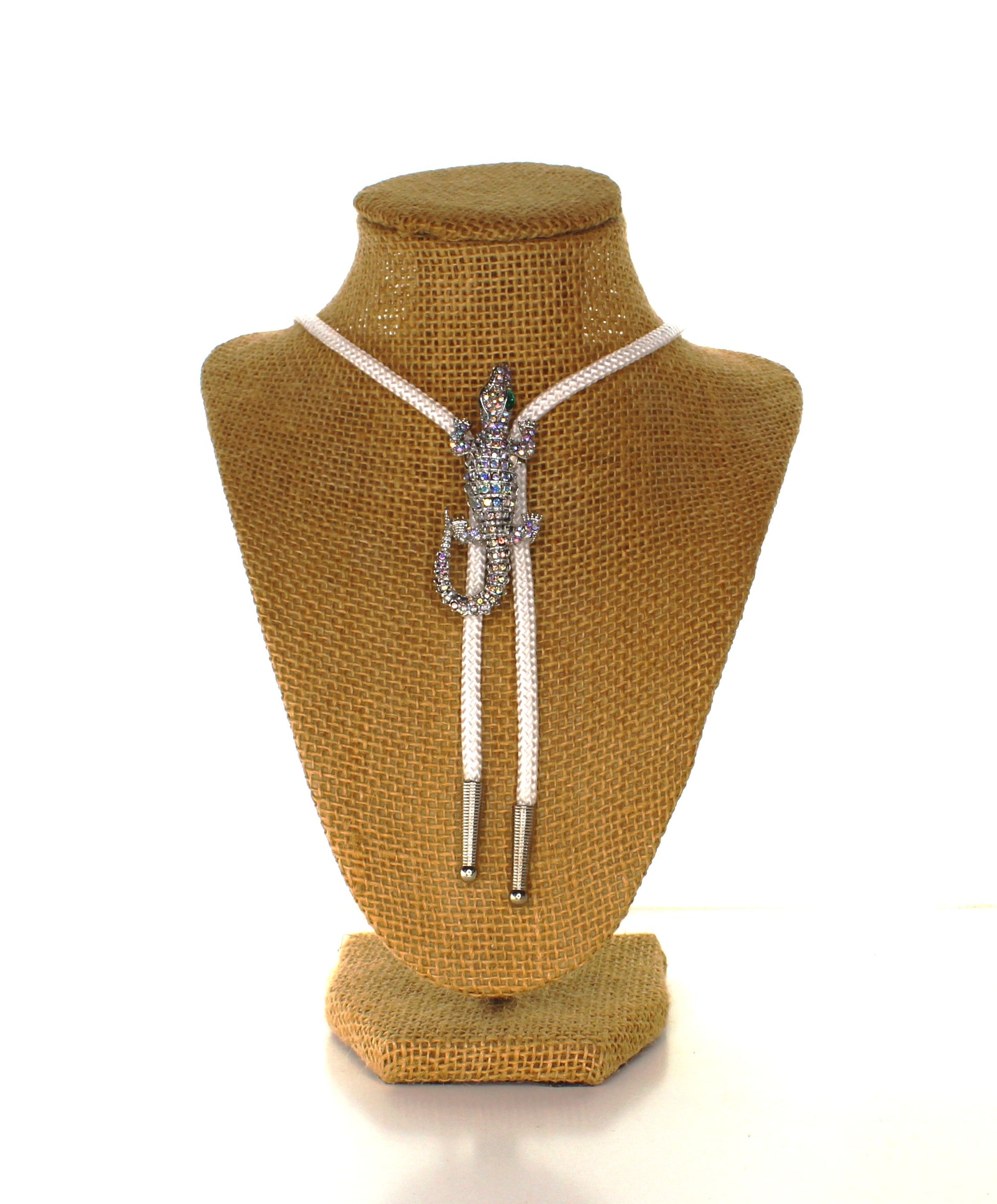 Rhinestone Alligator Bolo Tie (Black or White Cord), made in USA, sold by each