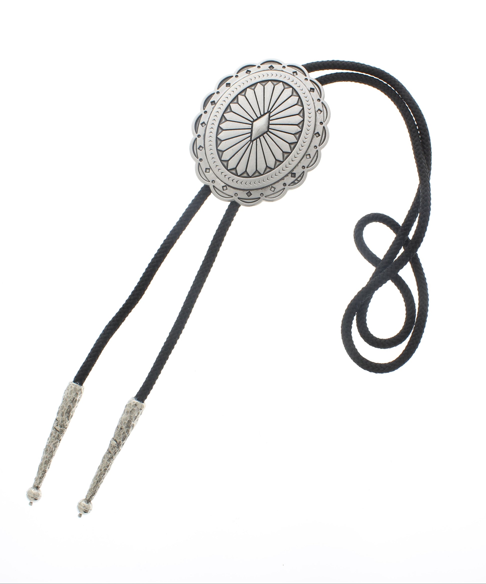 This bolo tie features an oval silver-tone concho centerpiece with a detailed sunburst and diamond design, framed by scalloped edging for a classic Western look. The braided black cord is finished with textured silver tips, making it a timeless accessory that adds bold Southwestern style to any outfit.