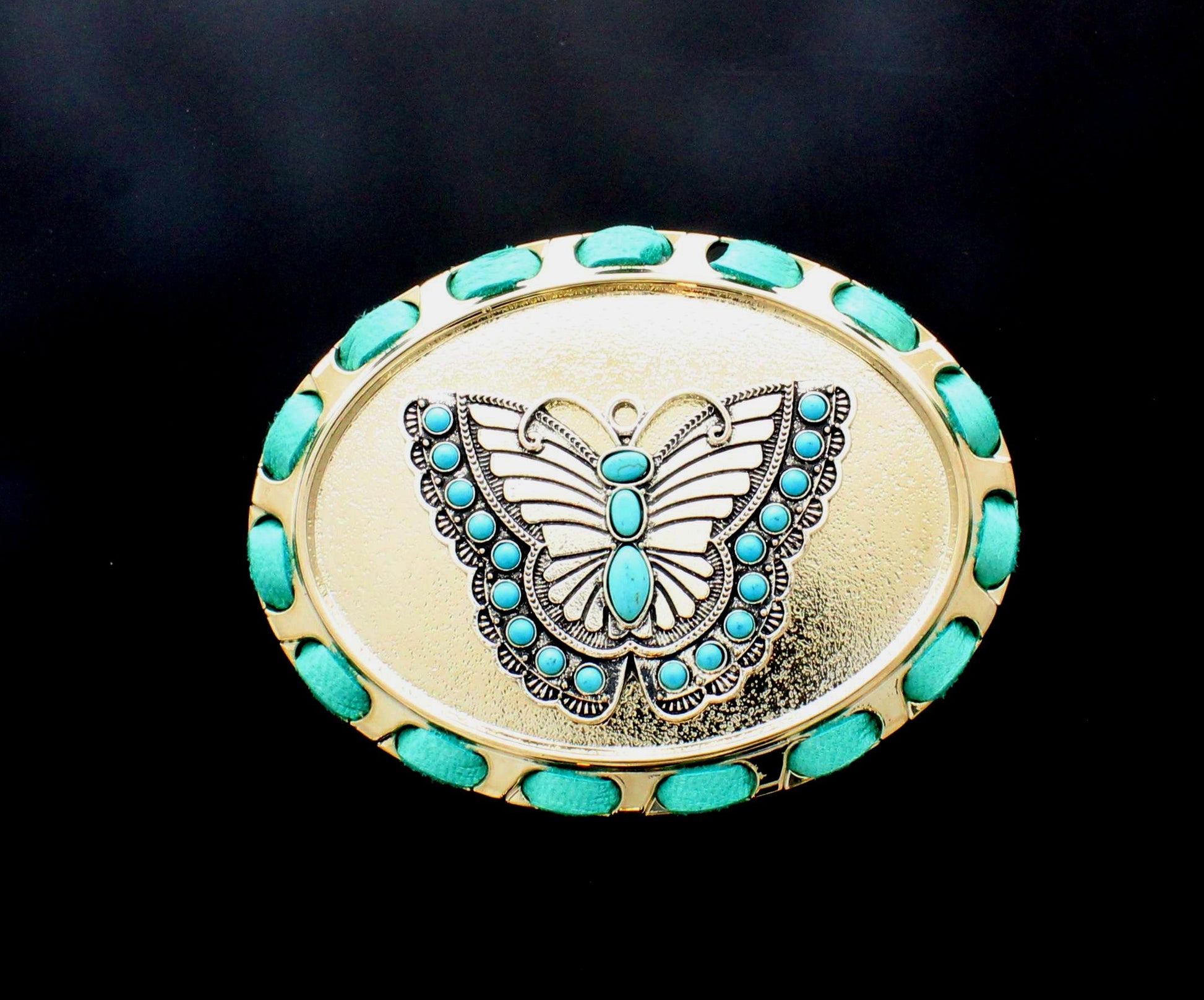 This elegant oval belt buckle features a beautifully detailed butterfly design adorned with turquoise stones that accentuate its wings and body. The polished gold-tone base is framed by a border of turquoise inlays, adding a Southwestern flair. A perfect blend of rustic charm and refined craftsmanship, this buckle brings a touch of nature-inspired elegance to any outfit.