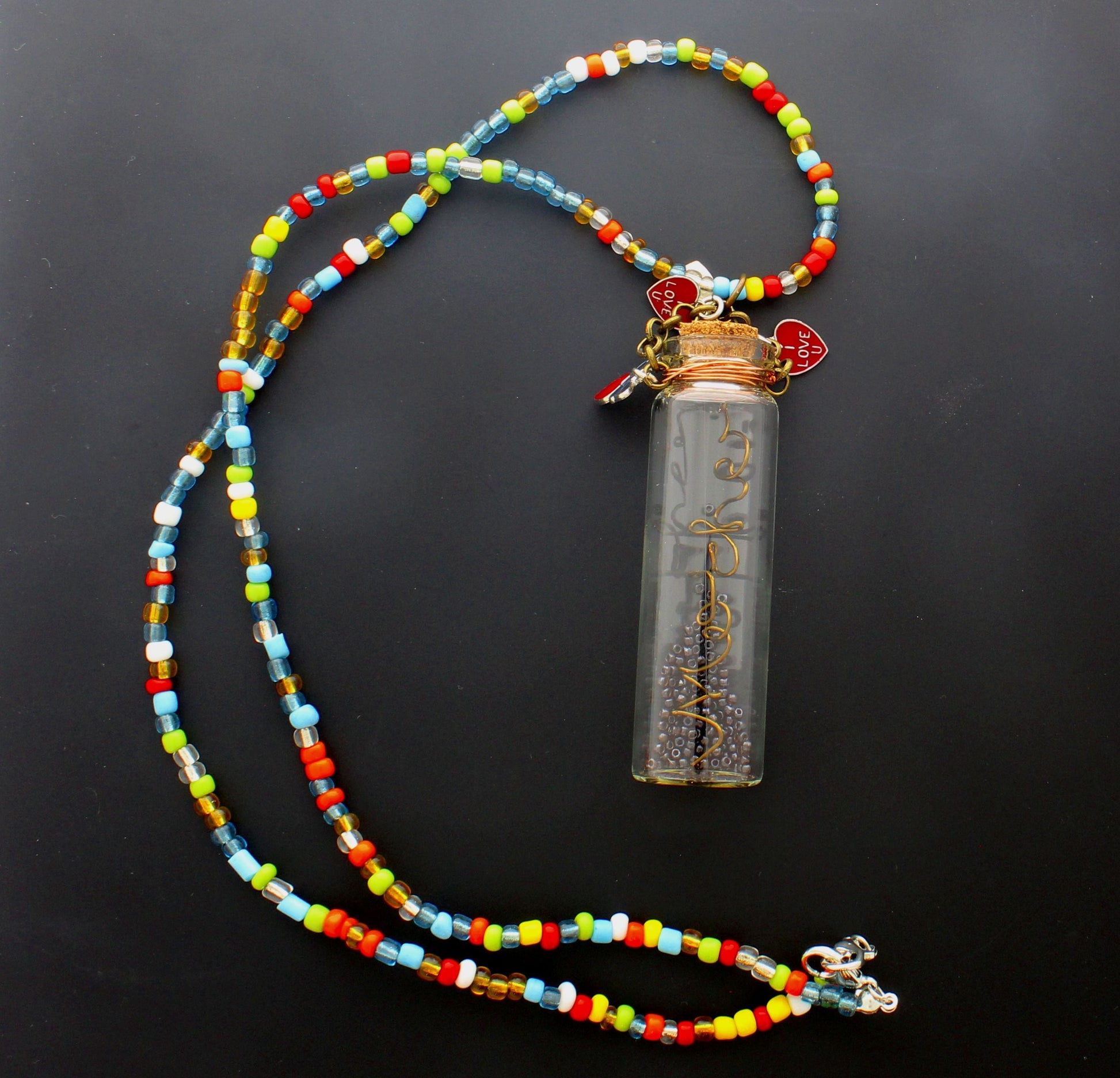 This vibrant necklace features a colorful beaded strand and a unique glass bottle pendant filled with tiny beads and adorned with a gold wire "Mother" detail. Accented with heart-shaped charms and a small elephant charm, it’s a playful and heartfelt piece perfect for celebrating the joy and spirit of motherhood.