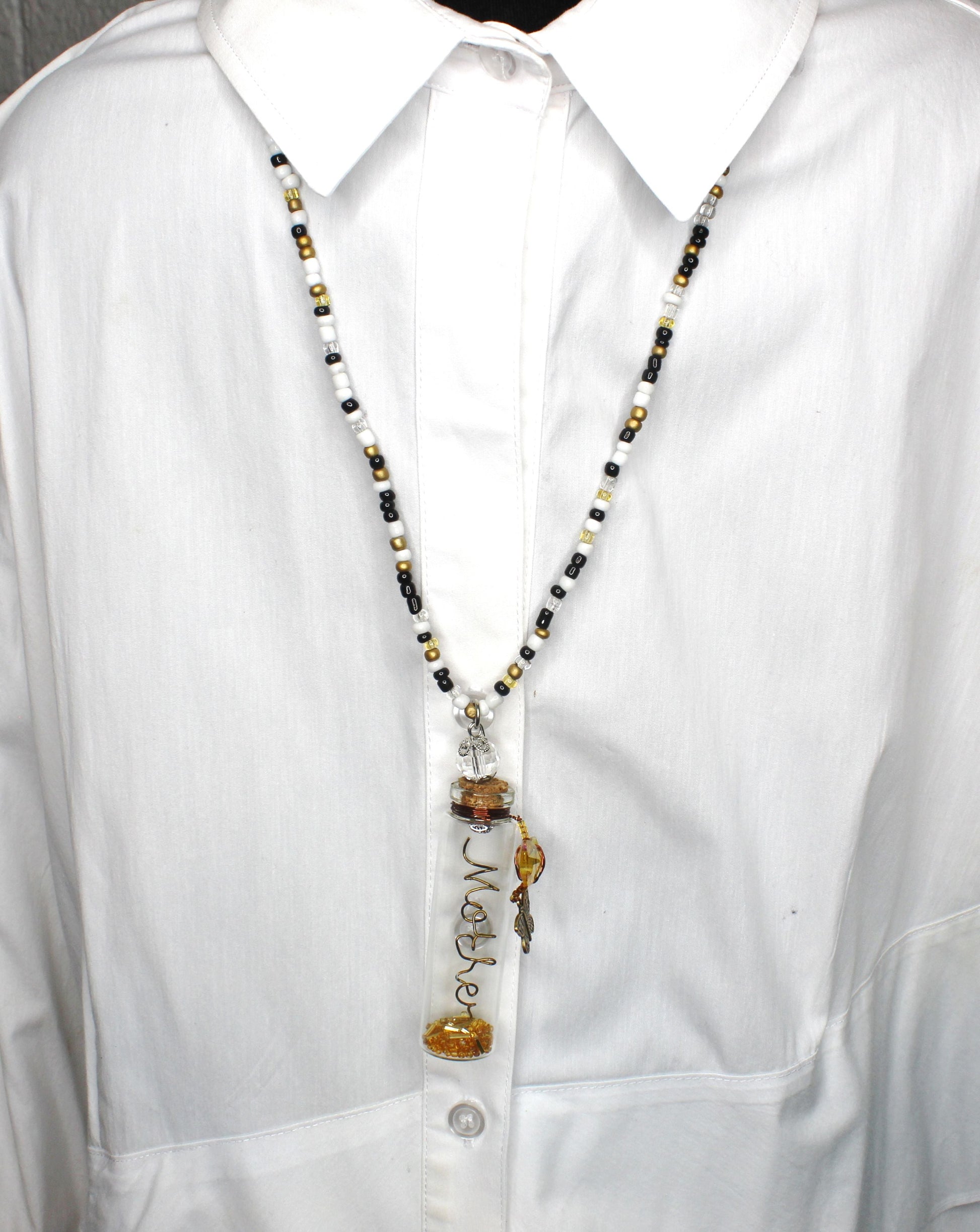 This handmade necklace features a delicate beaded chain in black, white, gold, and amber tones, accented with charming butterfly charms. At its center hangs a clear glass bottle pendant filled with golden elements and a beautifully crafted wire spelling the word "Mother," making it a heartfelt and unique keepsake or gift.