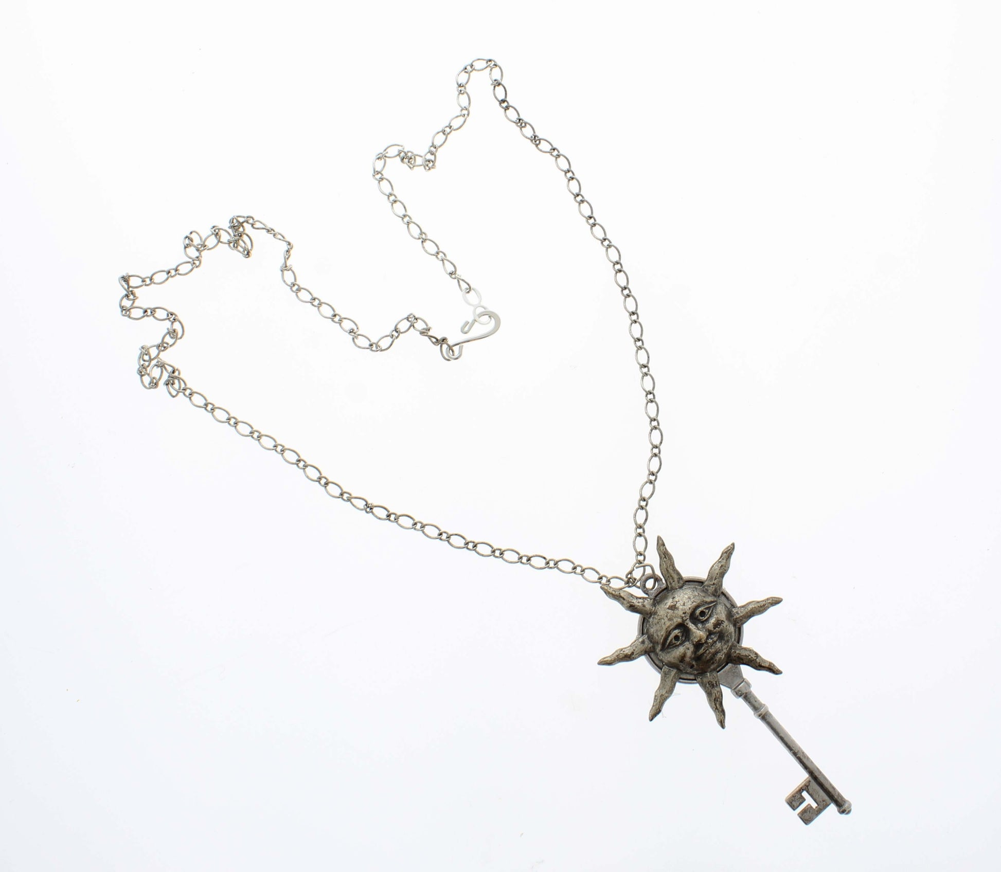 This unique necklace features a vintage-style key pendant adorned with a radiant sun face design. Crafted with an antique silver finish, the piece blends celestial charm with mysterious allure. Suspended on a delicate chain, it makes a striking statement accessory for everyday wear or special occasions.