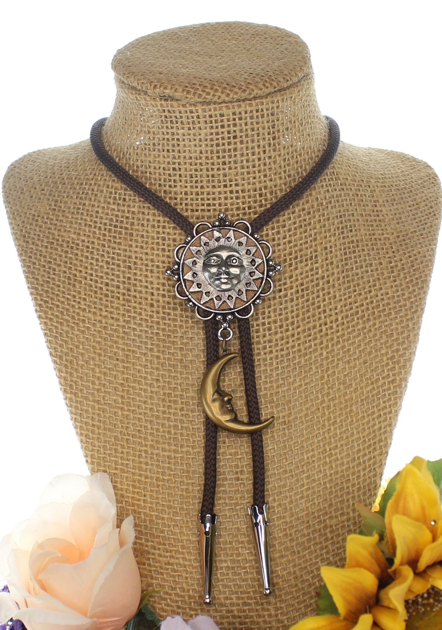 Striking and celestial, this bolo tie features a black braided cord with polished silver-tone tips and an ornate silver-tone concho showcasing a detailed sun face. A gold-tone crescent moon charm adds a dramatic drop accent, bringing a bold day-to-night vibe to any Western or boho look.