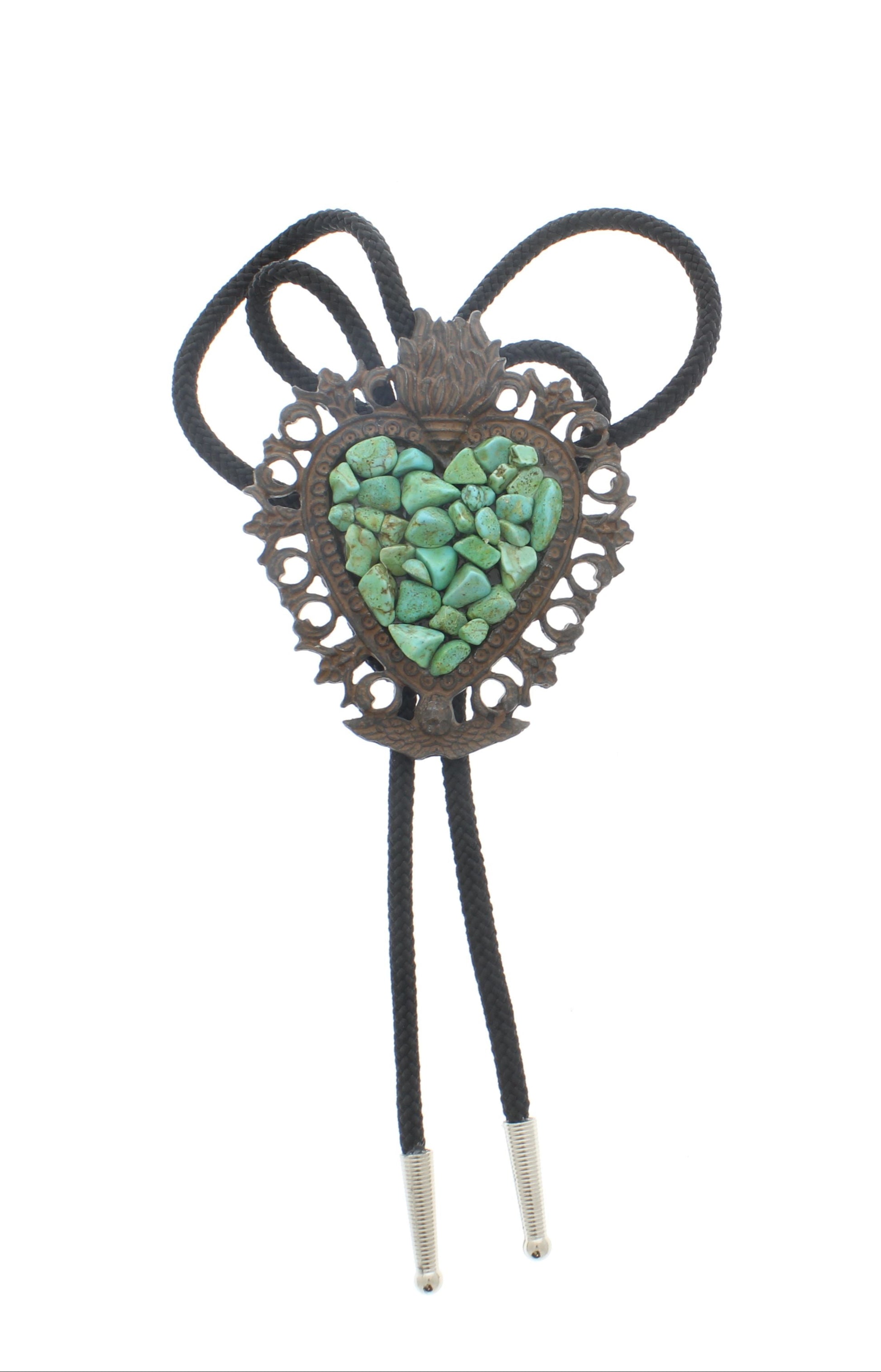 This striking bolo tie features a heart-shaped centerpiece inlaid with genuine turquoise chips, framed by ornate metalwork and a signature flame motif above. Choose from three unique finishes—antique copper, rustic brass, or bright silver—each adding its own character to this fiery symbol of love and resilience. A bold piece with Southwest soul, perfect for adding a touch of sacred style to any outfit.
