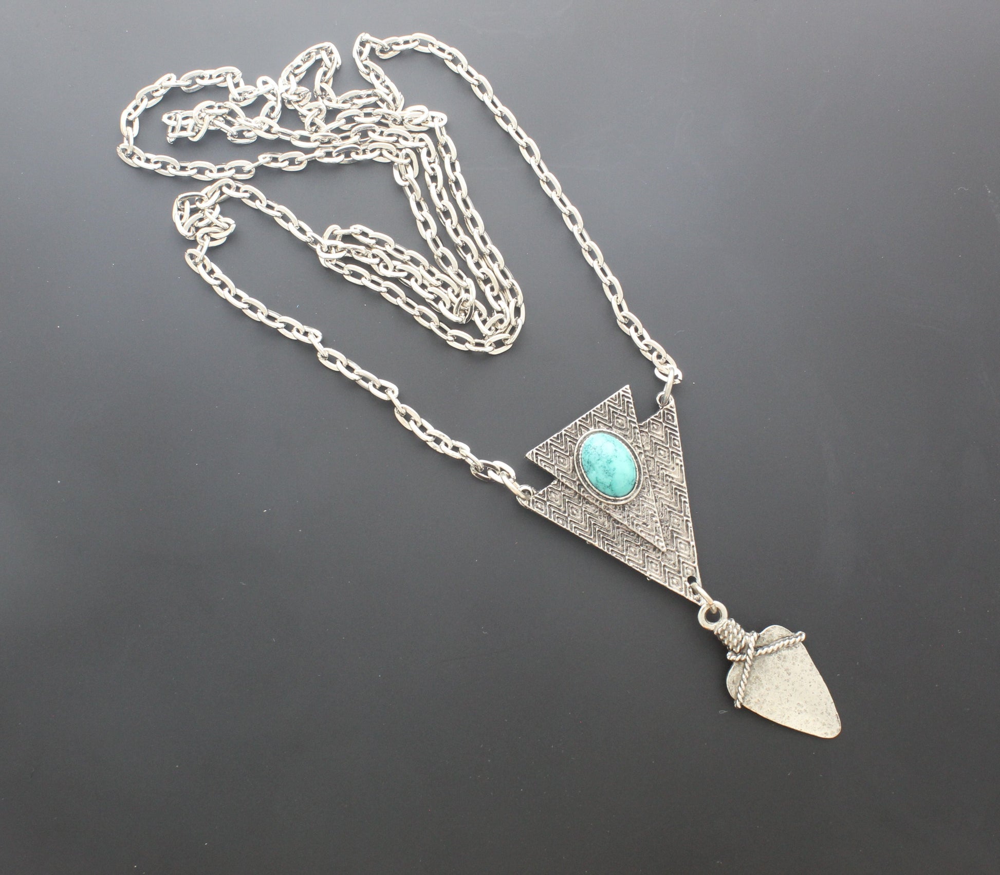 This bold necklace features a layered geometric pendant with etched tribal patterns and a striking turquoise stone at its center. Finished with a silver-tone arrowhead charm and hung on a chunky chain, it’s a powerful statement piece that channels both heritage and edge. Ideal for adding a touch of rugged elegance to any outfit.