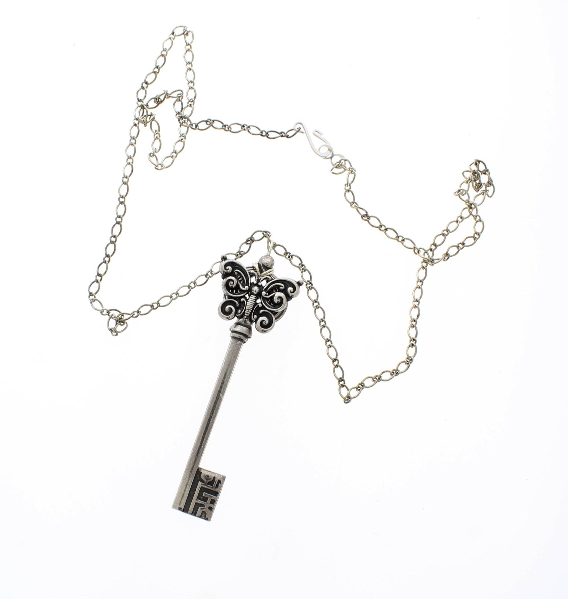 This elegant necklace showcases a vintage-style key pendant topped with an ornate butterfly design. The intricate detailing adds a touch of whimsy and charm, symbolizing transformation and freedom. Suspended on a delicate chain, it’s a perfect accessory for dreamers and free spirits alike.