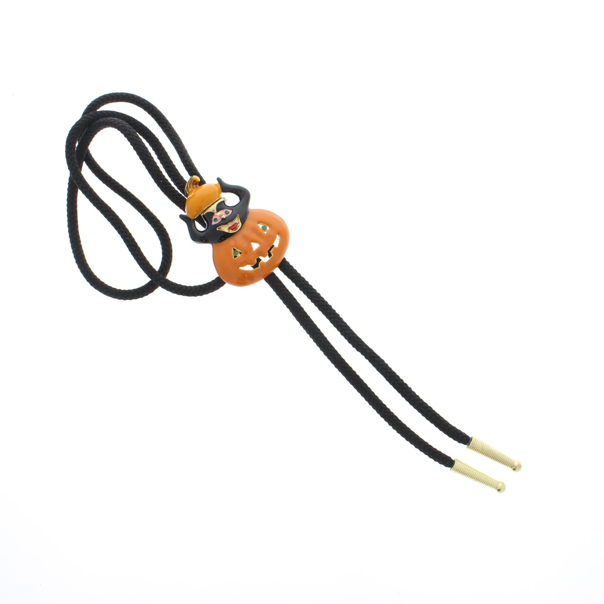 Add a spooky twist to your western style with this Halloween bolo tie featuring a grinning orange jack-o’-lantern pumpkin topped with a mischievous black cat in a witch hat. The vibrant centerpiece sits on a smooth black braided cord with gold tips, giving it both durability and festive flair.