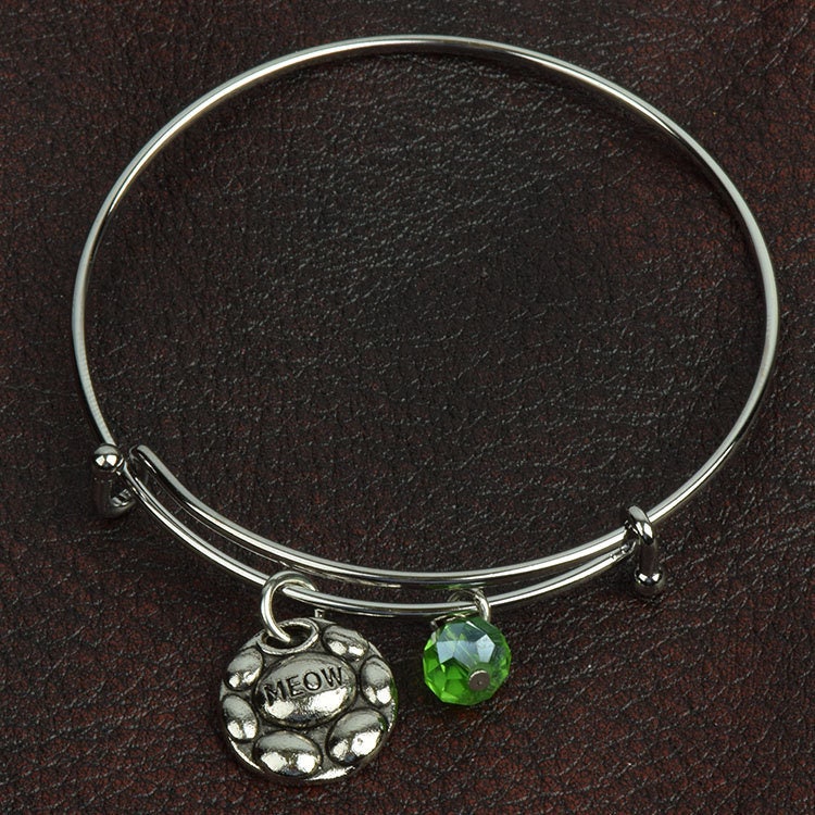 Adjustable bangle bracelet with "Meow" cat charm and crystal bead in red, blue, black, crystal, green or pearl.
