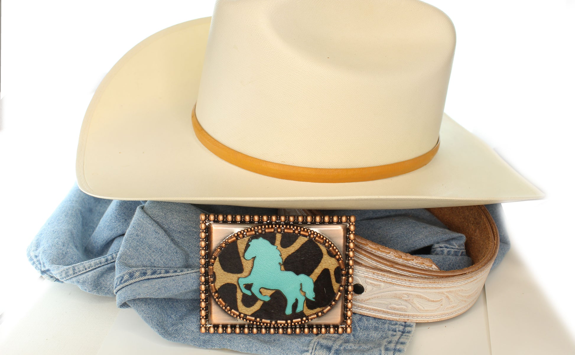 A leopard-print horse silhouette overlays rich turquoise leather, galloping with wild elegance across the buckle’s center. Framed by alternating copper beads that echo the metallic body, this piece glows with desert heat and frontier spirit. The contrast of textures—fierce print, smooth leather, and gleaming metal—creates a dynamic tribute to untamed motion and Western soul.