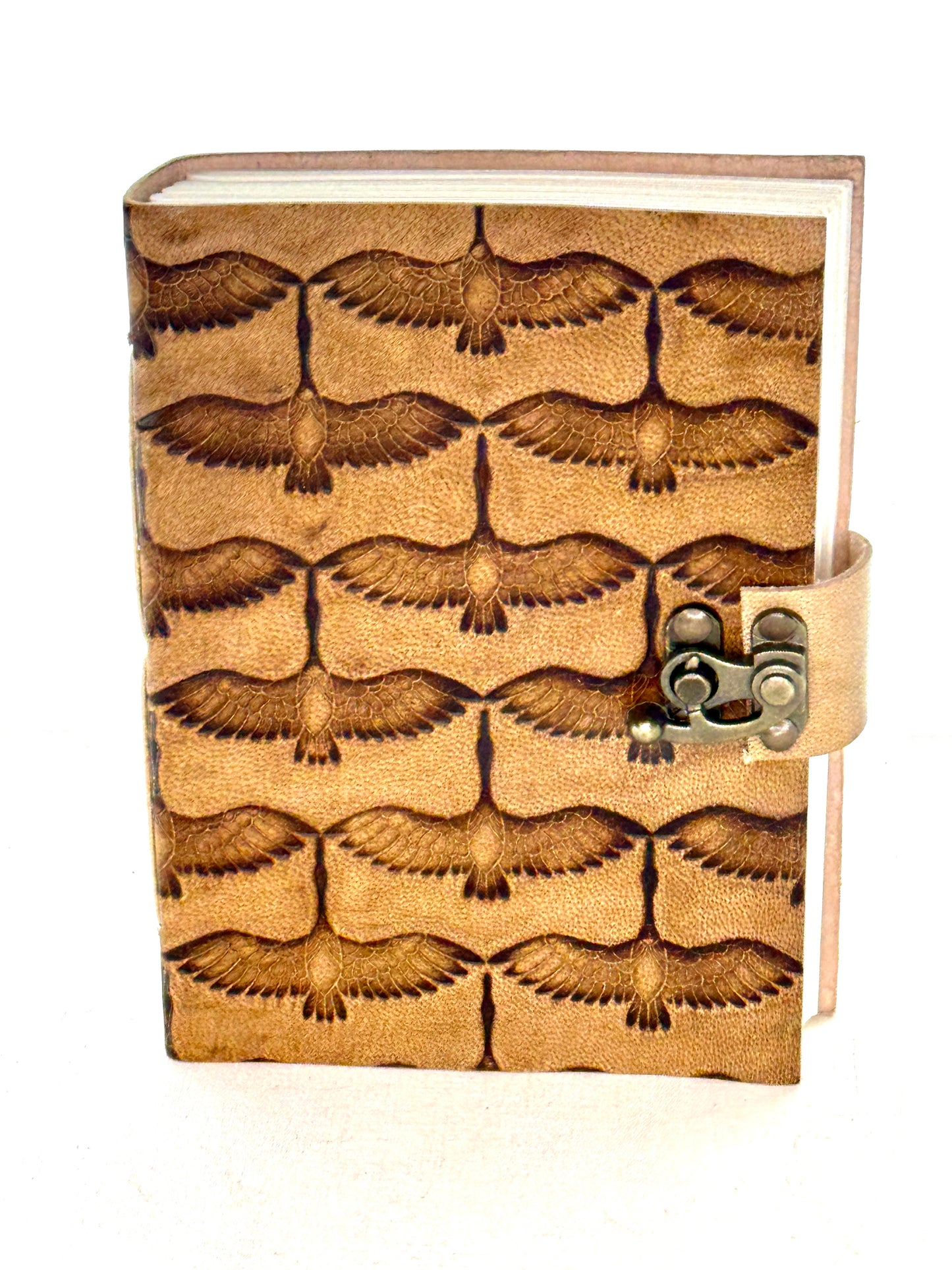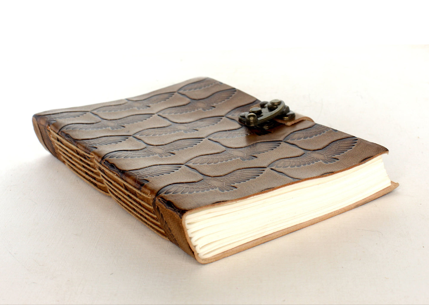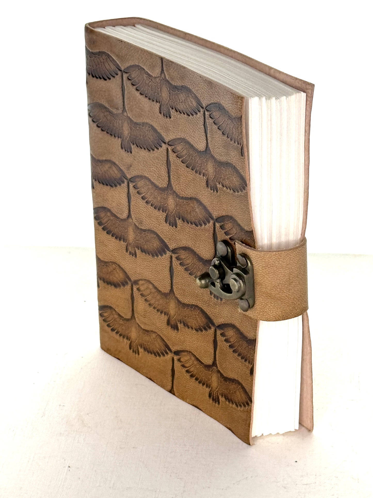 This journal features a striking and symmetrical embossed pattern of birds in flight, creating a sense of freedom and movement. The repeating design showcases birds with detailed wings spread wide, etched into a natural brown leather-like cover. The texture and craftsmanship lend it a rustic yet elegant feel.