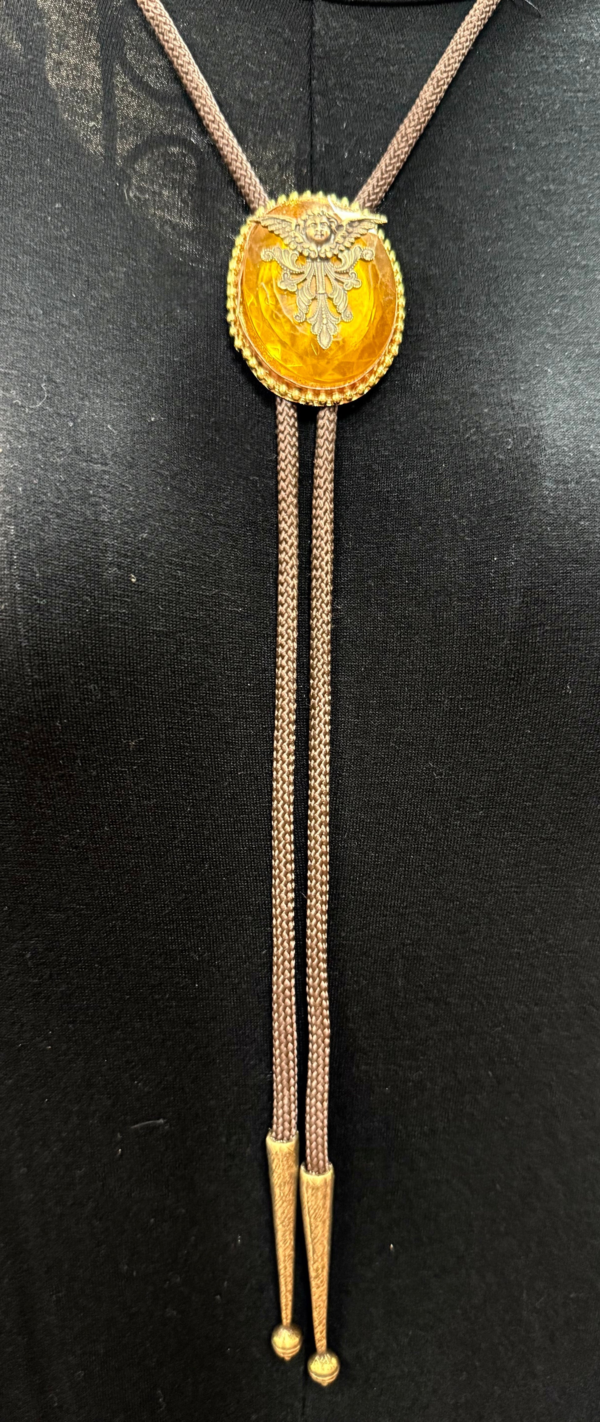 This jewelry set features a Western-inspired bolo tie and two pairs of coordinating earrings. The bolo tie showcases a braided dark cord with antique gold-tone tips and an oval amber-colored stone centerpiece, accented with ornate floral detailing. The set includes a pair of dangling earrings with intricate filigree designs and amber accents, as well as a pair of simple amber-hued stud earrings for a versatile look.
