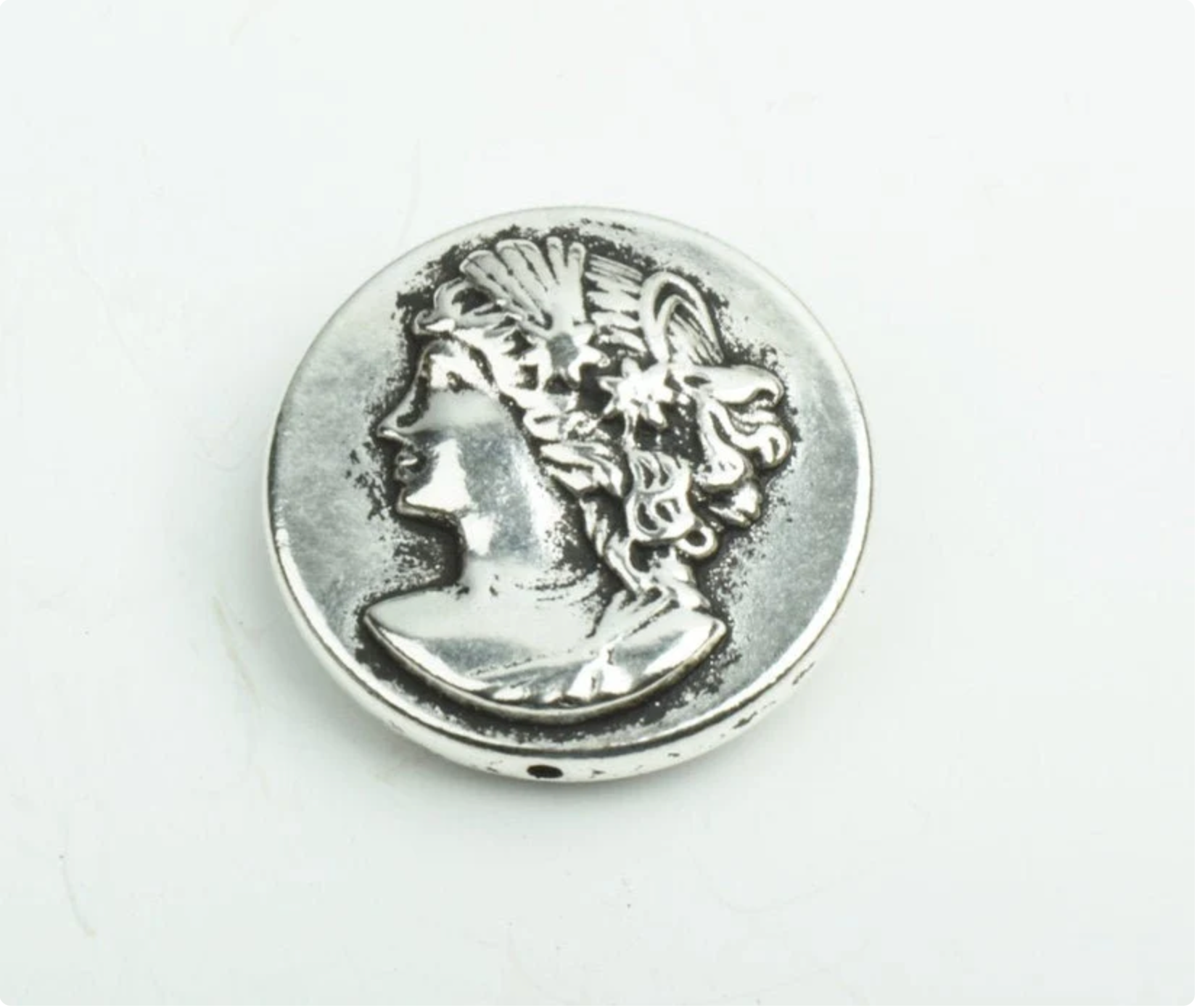 Greek Roman Goddess Cameo Face Coin Bead, Greco Roman, 30mm Round, Antique Silver, double sided, pack of 6
